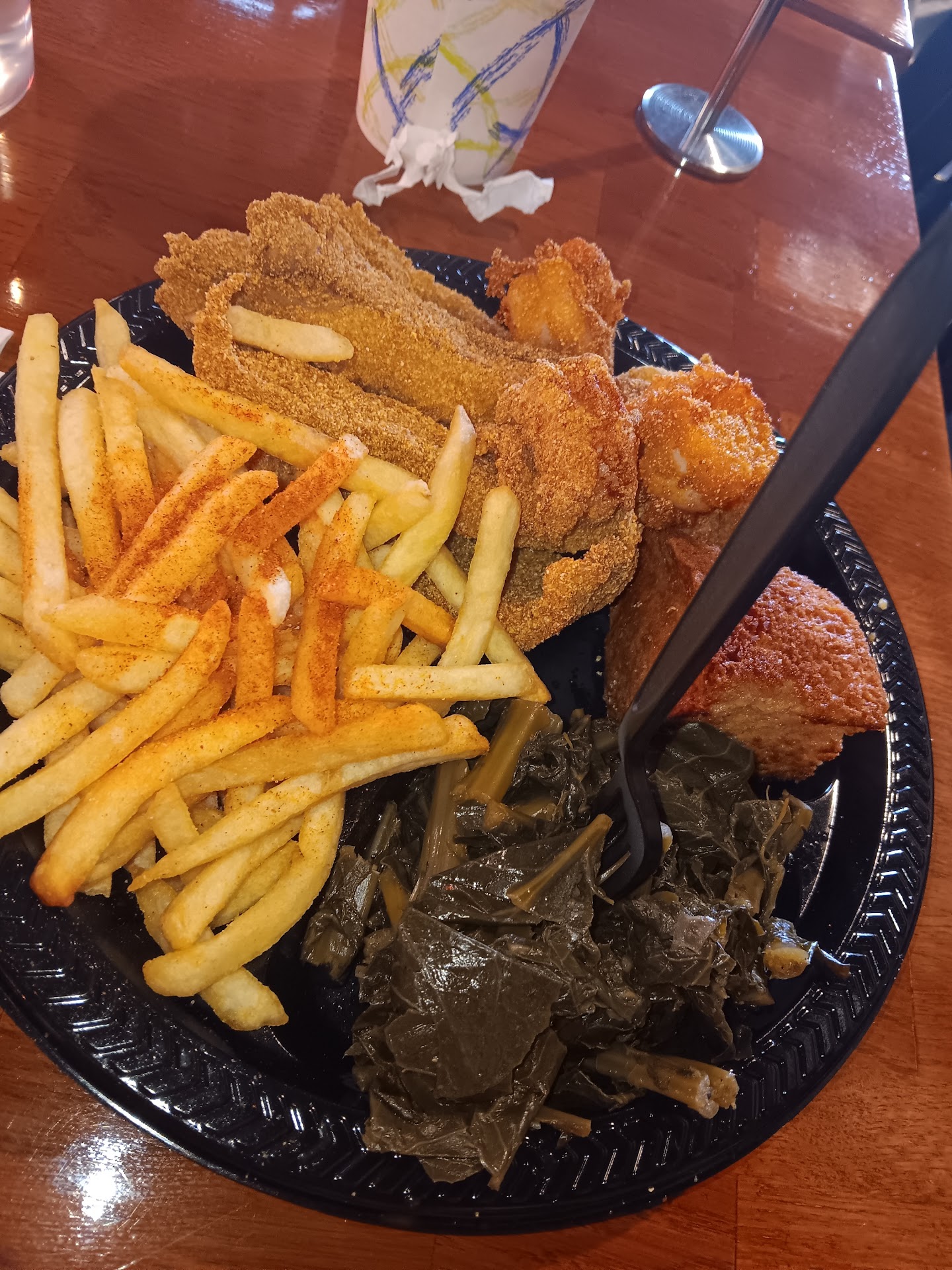 My plate came out smelling like heaven and looked just as good. Every single thing on my plate I was thinking "this is the best I've had". The cornbread was phenomenal. I could not believe how good the cornbread was. It was crunchy on the outside yet moist on the inside and tasted almost like cake. The catfish was also super crunchy yet retained it's moisture. It came with hotsauce, tartar sauce, and "gator sauce" which was a peppery ranch sauce dyed green but the fish was so good I barely used any condiments. All the side dishes were flavor packed and loved them all.
