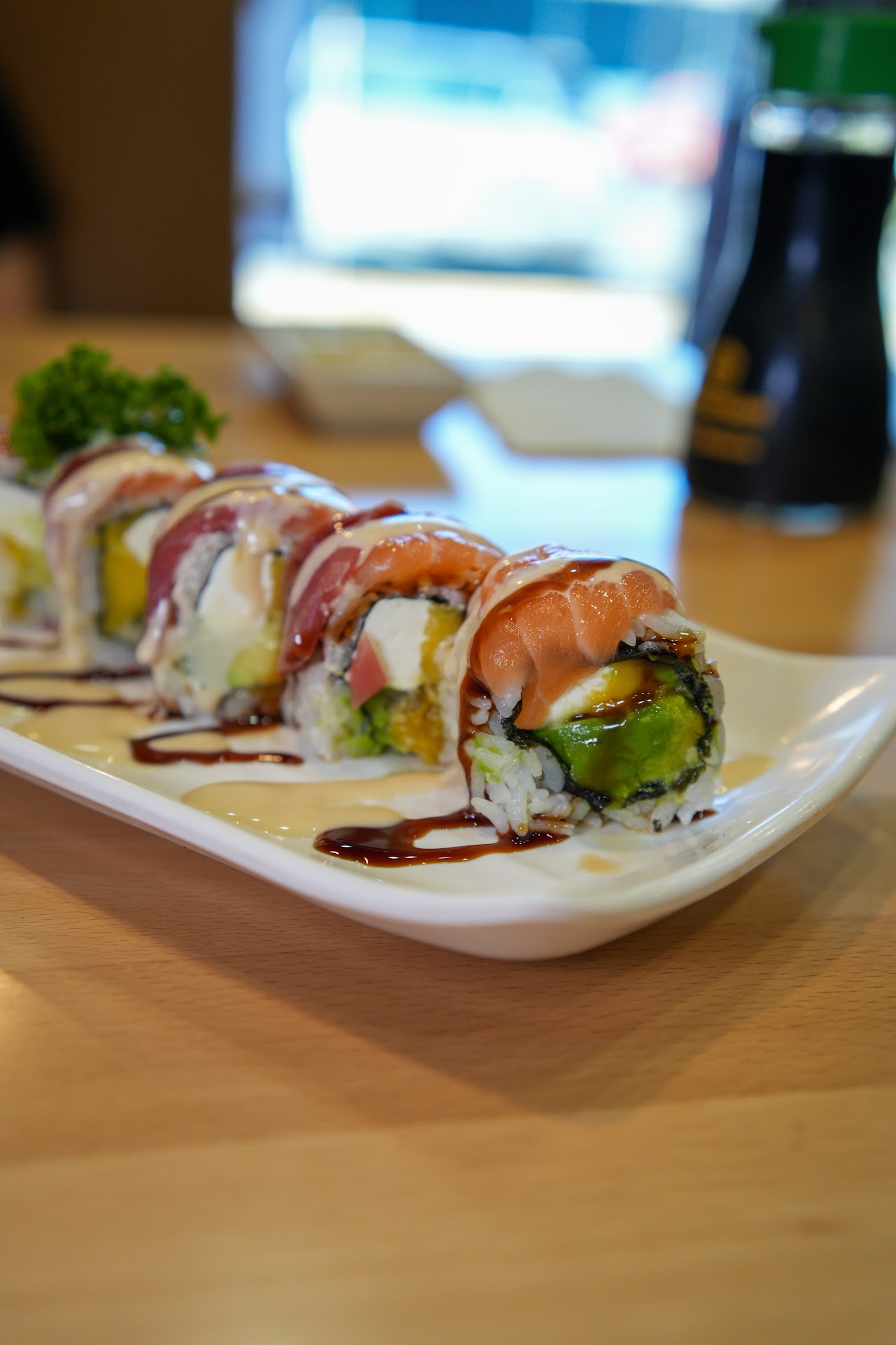 As we settled into our seats, it was clear that the restaurant was shining with eye-catching lights and chandeliers. The environment was modern, beautifully decorated, and well-lit. We could see the sushi chefs working immaculately to create the perfect rolls, and it was a treat to see their craftsmanship.