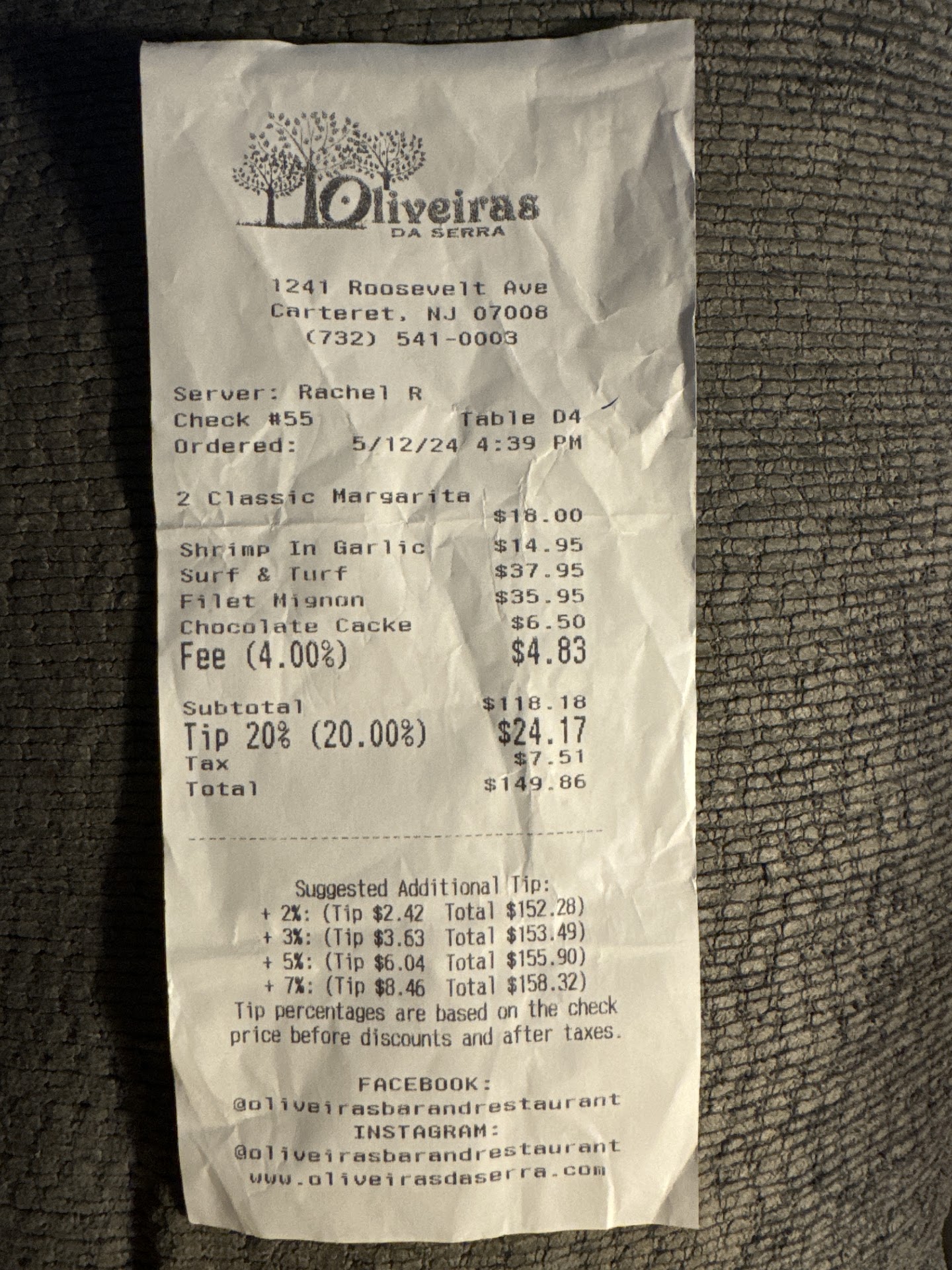 Read moreHorrible, inattentive service. Place is outdated and looks like an old basement turned into a dining area. Food, meh. Prepared well but small portions. Chateau Madrid is better on all counts. Now for the SCAM: Dinner for 2. I ordered the surf and turf for $38.00. You literally get a 2oz piece of meat (cheap filet? SMALL) and maybe a 3oz tail, some good homemade chips, saffron rice and some veggies consisting of 4 pieces of sliced carrot and 4 green beans and the rest was sautéed cabbage as a filler. Who the f… wants cabbage??? CHEAP! Fast forward to the bill: They charge a “4%” FEE on top of the meal. FOR WHAT? This was BEFORE I even took any form of payment out of my pocket! The 4% is actually equivalent to 4.26%.of the food and beverage price. Then, they calculate the automatic “20%” tip (mind you only 2 people at this table) with the 4.26% FEE included. It gets better….the tip is actually equivalent to 20.45%. The tax was the only thing that was calculated correctly/with the correct % on the food and beverage amount only. The best part is, on their receipt they have a “suggested ADDITIONAL tip” perhaps if you think the cabbage was extraordinaire! This place is a dirty scam. Will never go back and would not recommend to anyone but my ex-wife and...