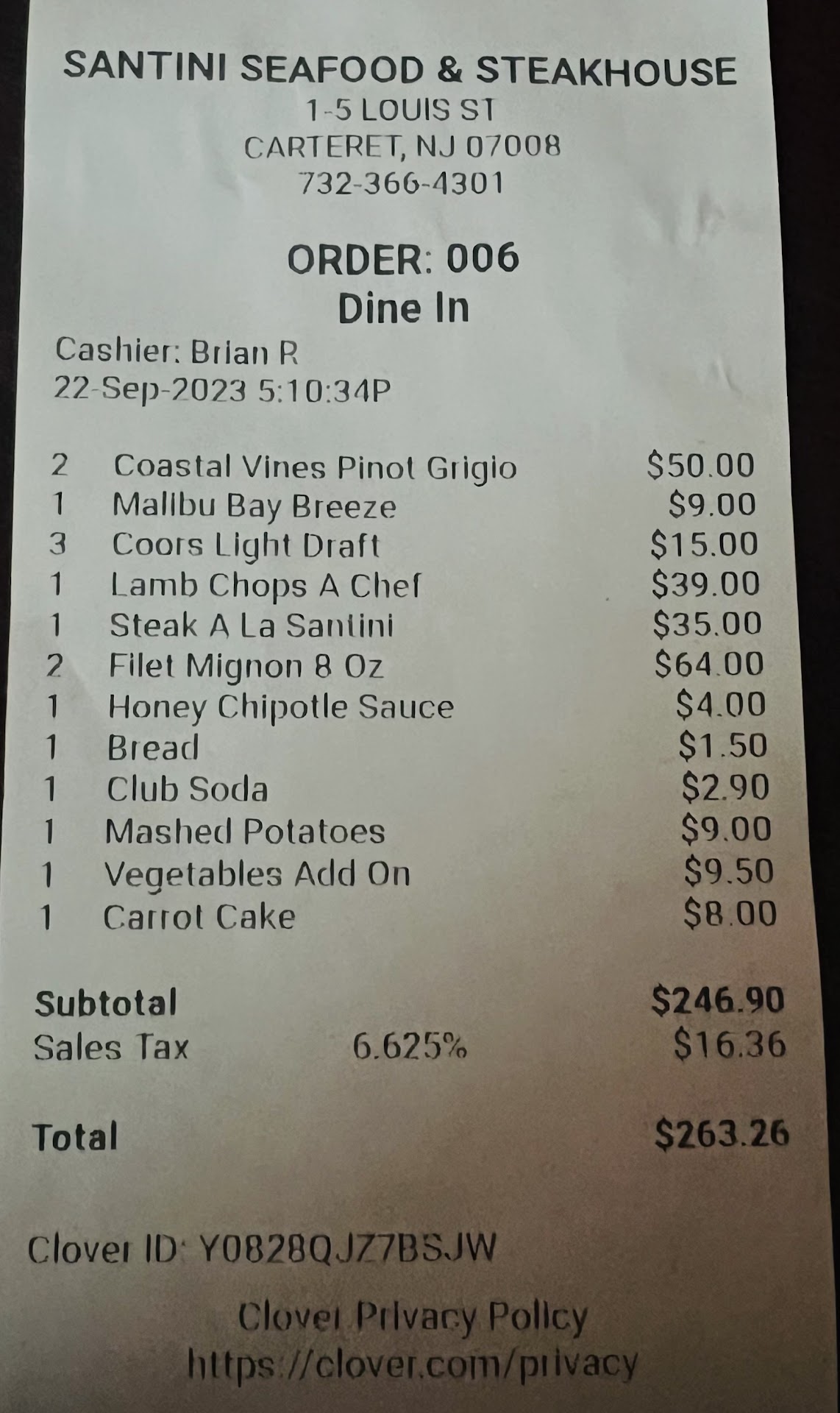 Ā Ā Ā Read moreVery nice and clean. At right away and the waiter was very attentive. Appetizers: The shrimp cocktail was fresh and delicious. Fried calamari was overcooked and had weird gardeneira and peppers on it. The marinara sauce that came with it was thin and tasteless like tomato soup. Main course: first, I ordered the cowboy ribeye for 39$. Shortly after the waiter came back and said the cowboy ribeye was now 56$. I understand markets change, but i just felt that should be done before you hand me a menu. Chicken francaise was fresh and very tender and the sauce was plentiful but a bit strong in the wine flavor. I ordered the 16 oz filet with roasted potatoes. I asked if they could make it a baked potato, but they said they couldn't. I received the 8oz filet. It was cooked nicely but it was a bit mangled. Like someone cut it open to see how it was cooked. The vegetables were hot but tasted like they were frozen vegetables. The rice was a huge upside down cup shaped pile of tasteless yellow rice. And the potatoes were sliced very, I mean very thin and were fried. They were dry inside and tasted like a plain potato chip. Definitely not what my mind imagined when I read "roasted potatoes". All in all, the food was edible and fresh, except for the frozen vegetables, but I would probably...