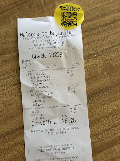 Read moreWell here in Cartersville we have 2 locations for which both are equally as horrible, after today I will go to neither. I like to give a restaurant 3 chances as I know sometimes you just have a bad day. Well today is their last chance. All 3 times my order is wrong, something missing predominantly. I do not notice until I get home, but today I checked before I pulled off and sure enough my gravy was missing, I flagged the person in the window she opened and snottly ask what do you want, I responded with I need my gravy please, she responded, its in your box mam, I said no it isn't, she proceeds to argue about a tablespoon of gravy, finally she said to me if it will shut you up I will get you a freaking gravy. I get home open my box of 8 piece its all legs, (I ordered mix) and my 4 biscuits where smashed. I absolutely hate this because I love Bojangles chicken. I am not usually one to leave a negative comment but when I came to the the review page I seen im not the only disappointed customer. I hope cooperate actually looks at these reviews and will act on them. We in Cartersville need your help... BOTH Cartersville locations are...