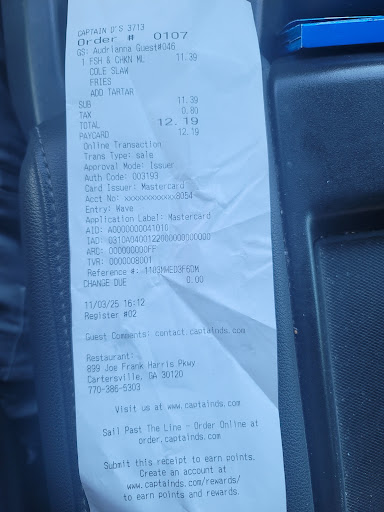 Read moreThe cartersville location is the worst I have ever been to. We arrived at 9pm, when we drove around to the drive through there was a lady wearing a headset and a man wearing a captain d’s shirt leaving over the rail outside holding hands. There was a truck already at the menu, we waited 10 minutes or so until the truck drove off and must have told the couple people were trying to order. When she finally came to take the order, they were out of this, out of that damn near out of everything. If they weren’t too busy standing outside smoking nasty cigarettes (probably didn’t wash hands before coming back to make food) and having a relationship outside, then they would be getting a better review. Fast food now days is you get whatever kind of employees are willing to work and now it seems like the lazy ones who can’t run a restaurant properly. Drive the extra distance to the...