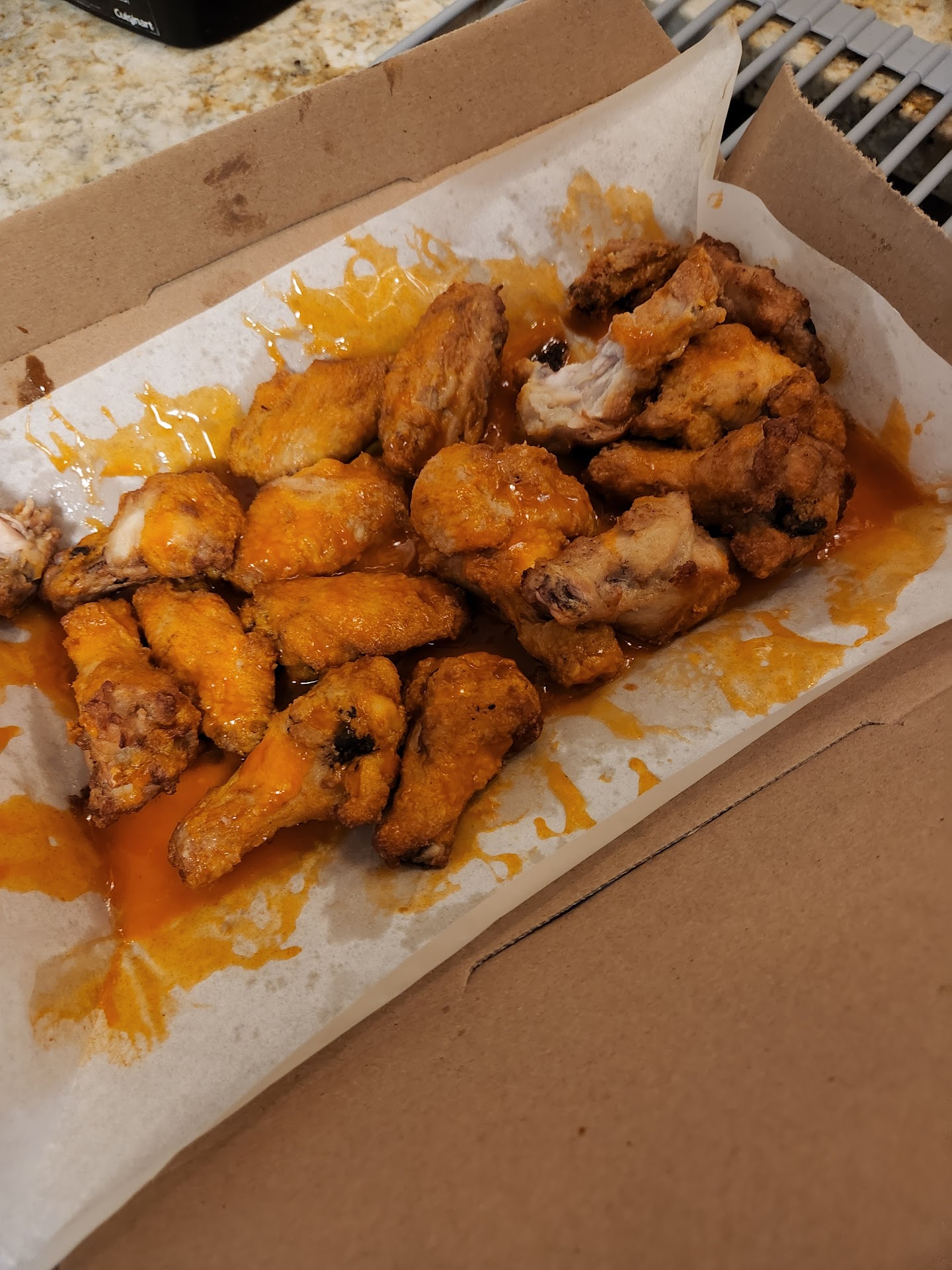 When we got home, and opened the boxes, first think I noticed was that the wings did not look like in the picture/advertising.. They were not well cooked, and were slimy and soggy.. No taste at all. Not really edible.. The pizza was nasty, and had grease everywhere and was soggy as well. It There was more grease than sauce.... My guess was they rushed the pizza and it was not fully cooked, or had one sitting and just 'preped' it.. Meanwhile our order of wings just sat in nasty sauce, probably for at least 45 minutes...