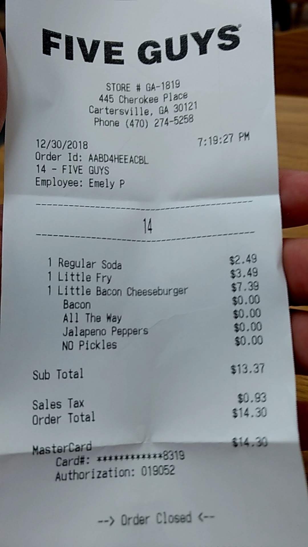 ย ย ย Read moreI ordered five guys tonight from doordash. I had a problem with doordash that I know wasnโt five guys fault. It took my food an hour and 15 minutes to get to me. When I did get it, one of my fry cups had less than 10 fries in it. I was baffled. I called five guys to let them know what had happened and I was told I had to come to the store for the problem to be fixed. I drove to the store and was then given a fry that was still not the size of their normal fry. I had to just grab the bag and walk out of the store because I was irate. All along my personal food was sitting at home getting even more cold than it already was for sitting in the delivery car for over an hour. What made me so unhappy was the lack of care given by the employees. I know it doesnโt affect them that I was unhappy, but they really did not care. I wonโt be visiting this five guys...