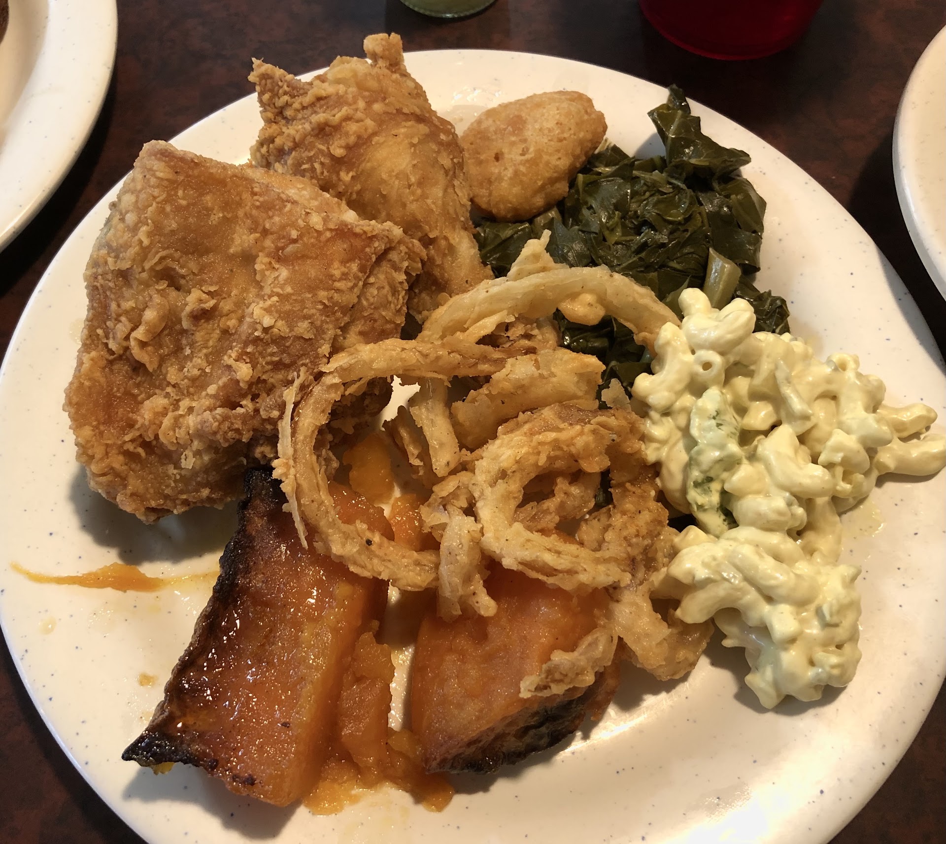 Read moreAs good as could be expected. I won't say it was great or fantastic but it was really good food and it was at a great price. The service was fantastic! The cornbread was almost perfect. It was moist and just the right consistency. If they would just back off the sugar it'd be some of the best I've ever had. Don't get me wrong but sugar just doesn't belong in cornbread, at least not enough to taste. The only reason to put it in at all is if you have bitter cornmeal. I like Corn Cake as much as the next guy, but it flat out sux to have sugar in your cornbread when you eat it in buttermilk or with pinto beans or Brunswick stew, and certainly not in cracklin cornbread! The vegetables were fresh and prepared correctly. The fish was a little over done but not burnt. The hushpuppies were good as were the pinto beans, and the baked chicken was wonderful! Yes I sampled dang near everything. The salad was good and fresh. As for the deserts I tried the Blueberry Cream Cheese pie, and a little Peach Cobler (I just couldn't resist!) And my Tea glass was never empty or out of ice! And that is important for a 100 degree day in October, the hottest on record they say....