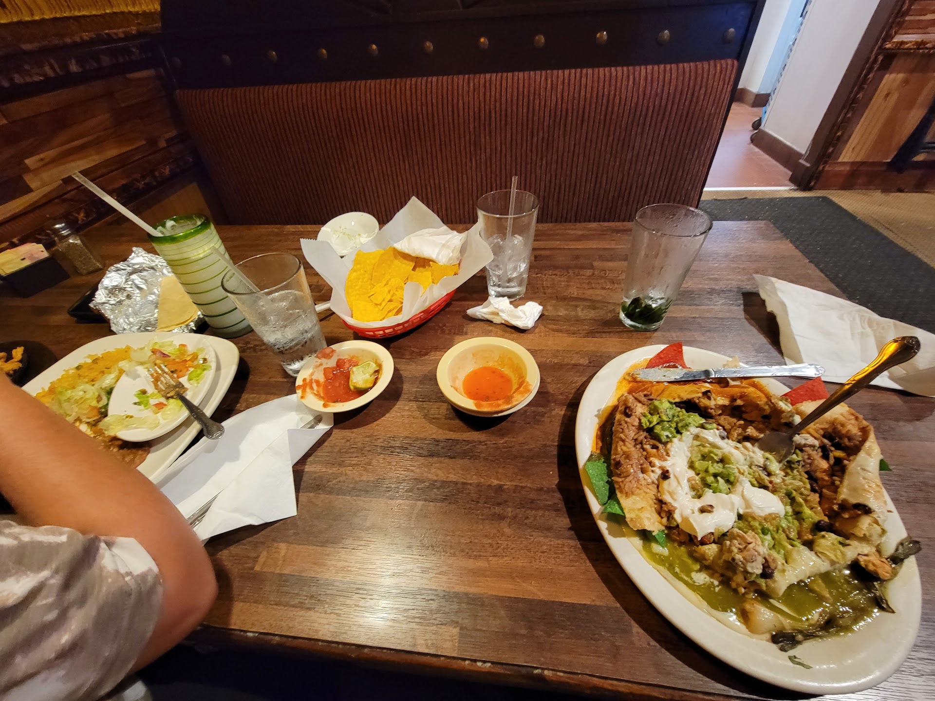 My sister in law and I went on Saturday night 7/29/2017 as a "girls night out" type of deal.. We arrived around 8:45pm... And the restaurant was almost empty, we asked to be seated on the patio because it was a beautiful night and the weather was fantastic!! We received chips and salsa almost immediately after being seated(but had tow a it for tortillas because they were out) , but it took about 25 minutes to get water, and place a drink order... Then three different servers came by to try to take our orders... No one knew what was going on it seemed... We finally got appetizers and the drinks we ordered around 9:30 and some napkins and silver ware around 9:45-10! Only to be informed that they would be closing at 10:30!! We had to go to the bar to order another drink because our server never came back (when I went to restroom, I saw her hanging out in a booth chatting with what appeared to be friends) I guess the bartender told the manager that we had to come to him to order more drinks because our server came storming out the door to patio rolling her eyes shortly after... We ordered cheese dip because there wasn't time to order a meal really... And then never saw server again until after 10:30 when she brought our check. This is ridiculous... When we finally saw her again around 10:30, we asked why they close so early and she informed us that she only works weekends and she just comes in, does her job and leaves... It's not really her problem what time they close. This is soo unfortunate... Because when she finally /initially greeted us... She seemed to have great energy and a wonderful attitude... Having been a server for many years in the past... I know it's not hard to at least fake giving a damn and doing a decent job!!! We didn't go in at the last minute (as some people were arriving and being seated at 10:30) because having been a server... I think that's incredibly rude. I've heard wonderful things about the restaurant and service... Prior to their move to the new location!! I wish I would have had the opportunity to go there... Because this was the worst...
