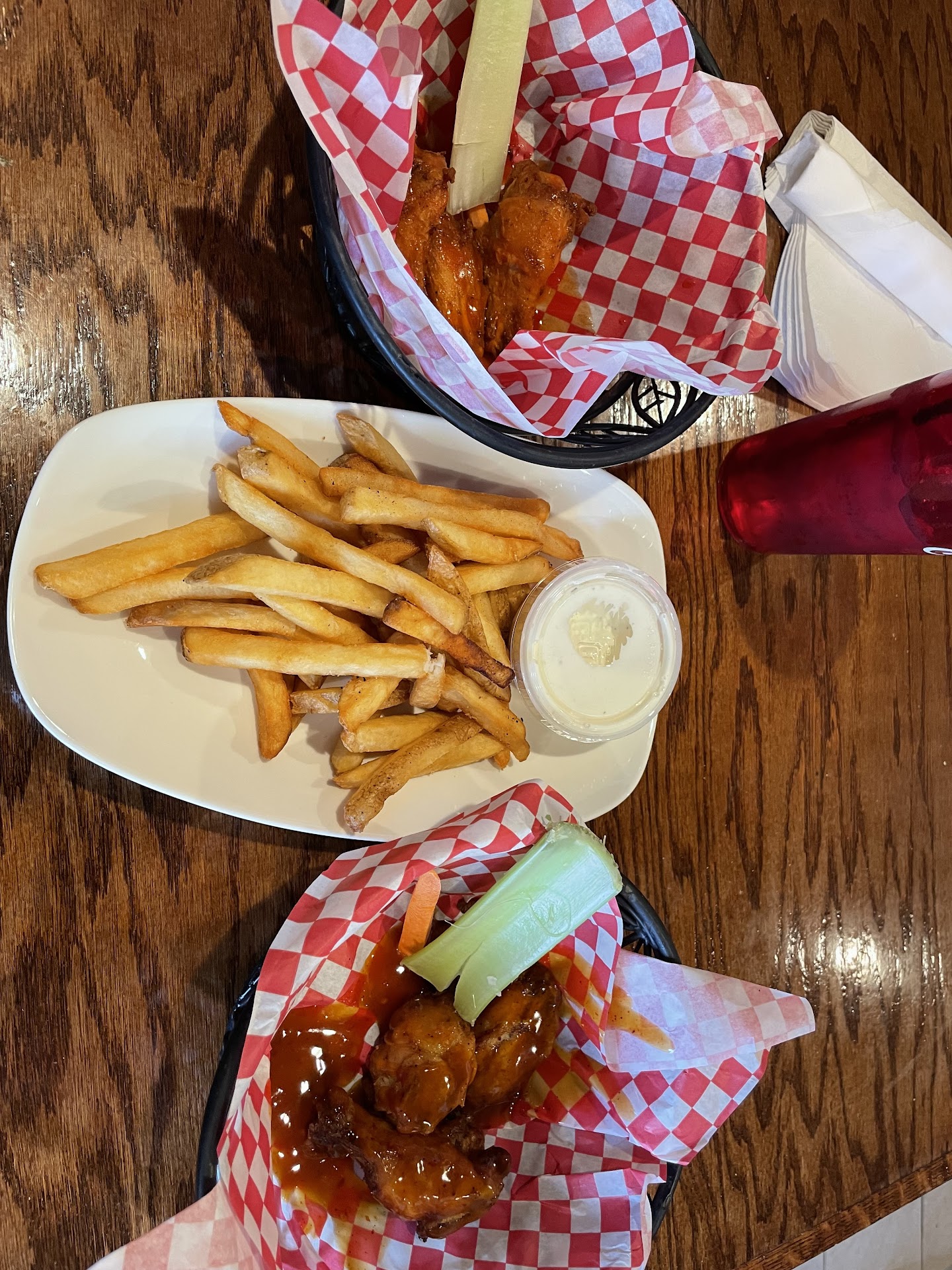 I had been here to Modern Sports once before and had outstanding service, good meaty wings with delicious flavors and a fair price. I've been trying to find some other wing places around to see how they compared to that experience and haven't found any. So I came back to see if they still were what I remembered...I really wanted those good flavorful meaty wings that I had previously. I ordered the wing lunch combo that has 6 wings and fries. They have several sauces and a few dry rubs to choose from. I decided to go with the Darn hot (the hottest they have and they use a different word than darn) and go with the server's suggestion of Mango Habanero. My server Kirsten was awesome! If all restaurants had a server like her....there would be zero complaints on servers. She was a grown up version of a Chick-fil-A worker. Before my tea was empty, she had me a refill sitting on the table. It took a bit to get my order since it was being made fresh. The wings apparently have lost their meatiness unfortunately and have shrunk down to what everyone else has (not as small as Zaxby's though). Although disappointed in the size, I soldiered on and tried the flavors. I was going to dig into the Mango Habanero first. The wings were hot, but the sauce was cold...not a good combo. The cold cooled the wings fast. It would definitely improved the experience if the sauce had been warmed prior to being put on the wings. They were decently covered in the sauce. Flavor...definitely good. Not much of the spicy/habanero flavor though...mostly mango. Would have been better if it had had a bit of spice. So next up was the darn hot wings. The sauce on these...warm the way it should be. Well....the bit that was there. The wings weren't covered too well with it. There was a bit of a puddle of it so I would rub the wings in it first. Definitely not darn hot. The flavor I did get was good flavor, just no spice. It was at very best medium. The fries were cooked well and had the expected flavor. I've heard that the pizza and burgers are really good and I'd like to try them. Would I return? For sure! The outstanding service that Kirsten delivers and all makes up for it. Their prices are still fair with comparison to others around. Additionally, they offer a...
