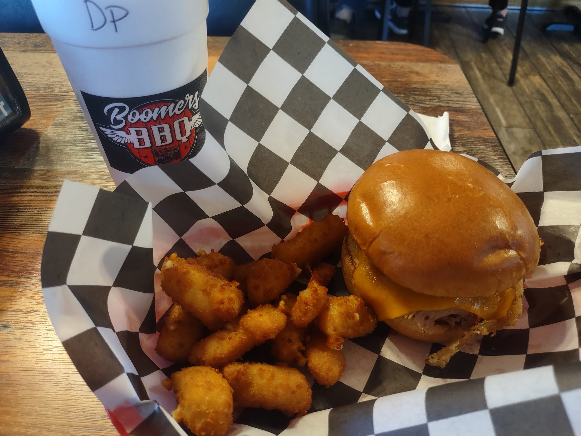Was extremely disappointed I was so excited about eating some where I've never ate before first off there was no high chairs and I played $20 for two adult meals and one kids meal me and my husband got the nachos we got brisket very plain only shredded cheese and sour cream plus extremely stale chips and the kids meal was $6 I got chicken chunks and waffle fries they litterly got 5 little chicken balls and 3 waffle fries to share redicules atleadt u could of gave five waffle fries! I never complain my husband kept wanting to say something and a girl came to our table and she said sorry I over heard you talking my nachos were super gross and stale to so we gave the food back and when my husband asked for a refund the girl said I can redo the nachos we declined because I'm pretty sure all the chips were stale and she tried denying that other ppl were bringing there food back up for something you are going to call loaded nachos at least offer five topping with the meat and chips not just sour cream and shredded cheese it drives me nuts all these places saleing Frito pie or nachos no body wants shredded cheese!!!!! We want nacho cheese!!!!!! Especially for $7 nachos! That come with no drink!? Reminds me to I drank my kids drink because there 2 and aren't allowed soda was so full of ice I litterly took 3 gulps and it was gone the only thing I appreciate of boomers is how respectful they were about giving us a refund and apologizing they are the first restraint I've had be nice about there mistake brisket and sauce was amazing waffle fries were awesome if you guys can just fix the portions and some stuff not plane and stale I'd gladly come bk when I got out of the car to walk in your restraint my mouth watered just smelling...