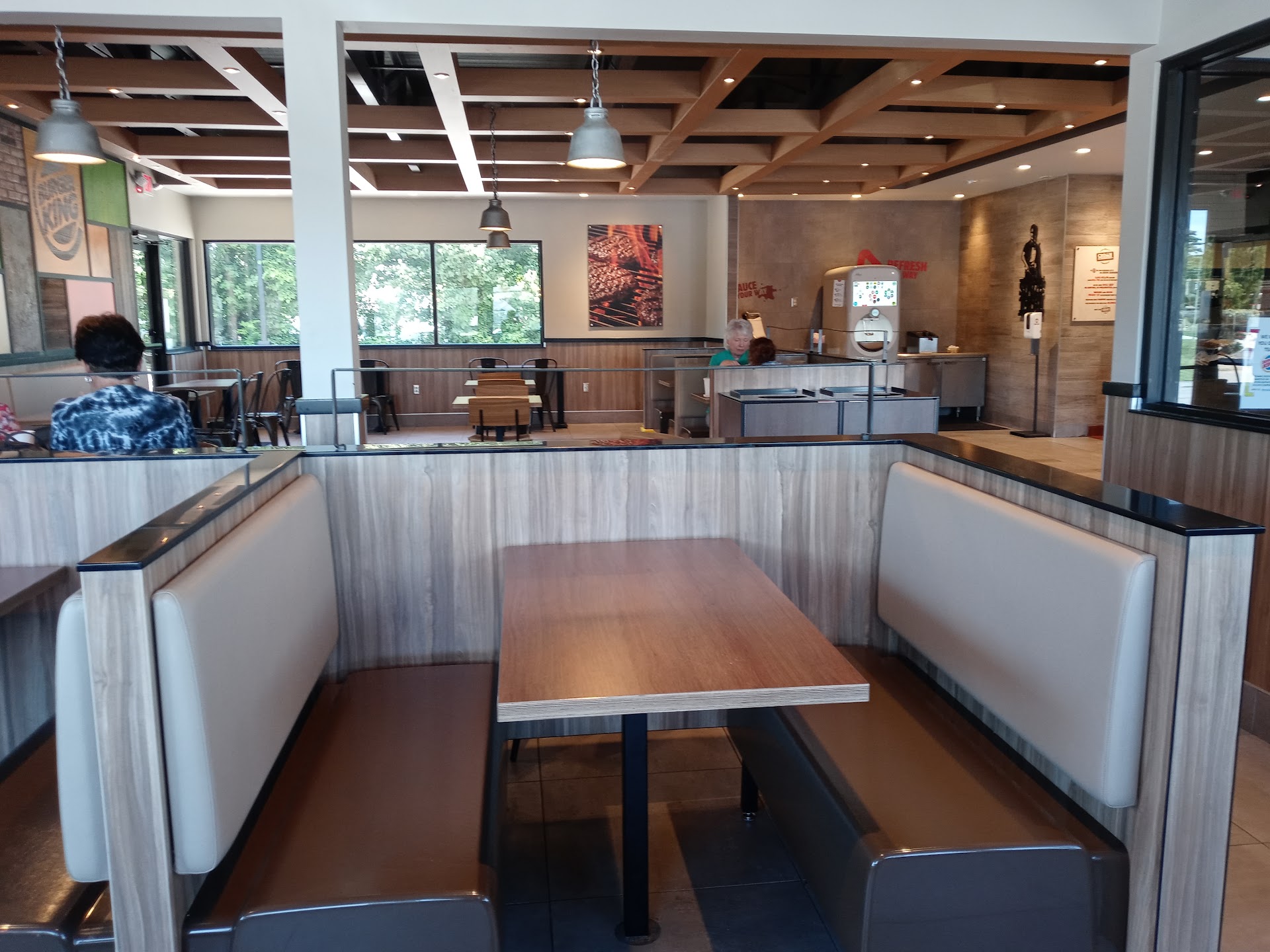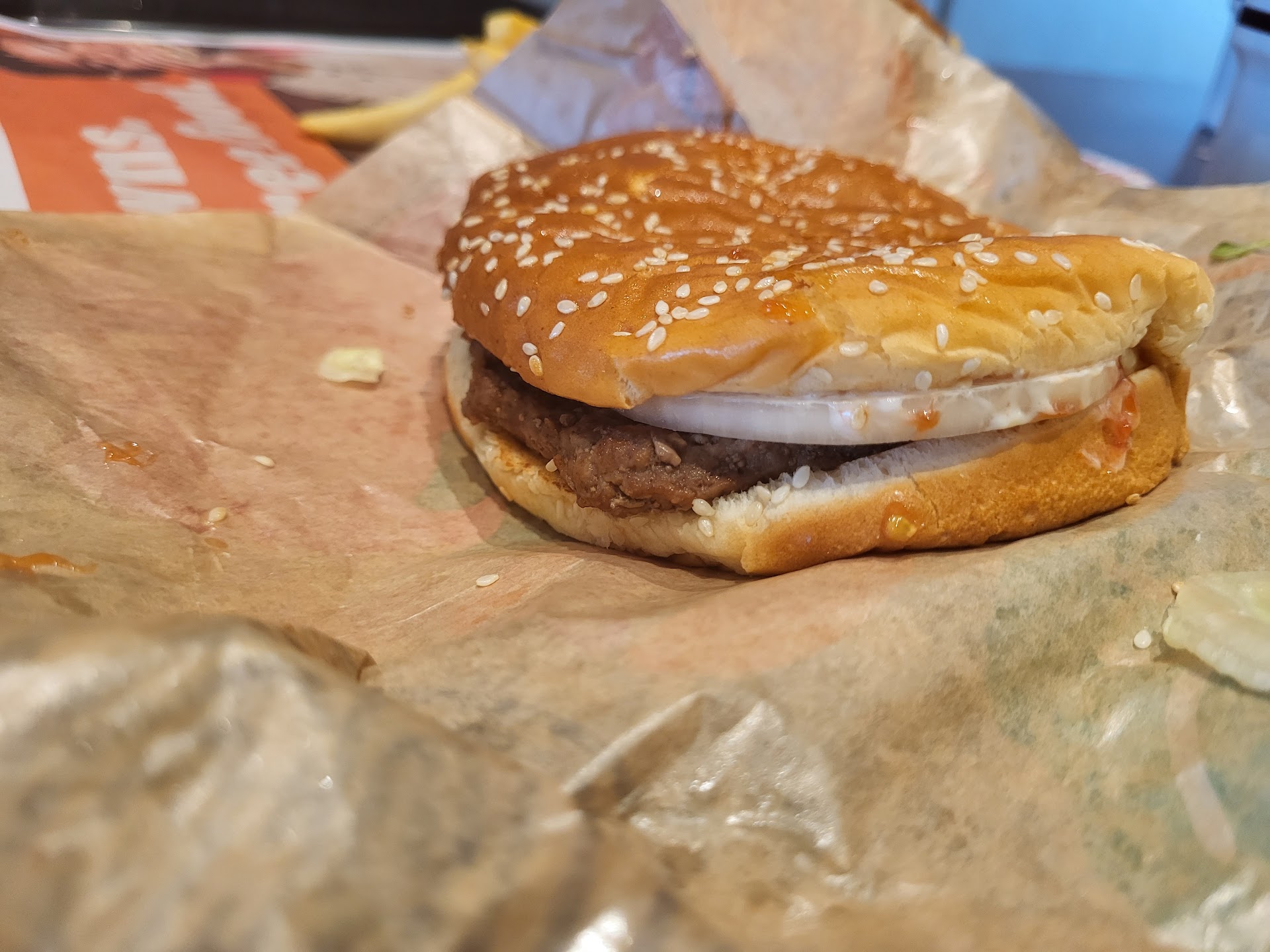 Must edit this review 4 years ago they received 5 stars from me. In that time they went so far downhill they went below ground. On this most recent visit at 4:50 pm while there were 5 people standing around in the parking lot the place was dead I should have taken that as a sign. Upon entering we ordered 2 whopper meals one with cheese one with no onion. We could see the fries and onion rings were already sitting under the heat lamp for how long would be anyone's guess. The employee handed us our cups went to the machine to fill them only to find out they were out of 90% of products. Employee said yeah that machines been out for awhile and that she could fill our cups behind the counter. While we are waiting for our order another customer entered placed her order was handed a cup and got the same results when she attempted to fill her cup. Finally we receive our order we go to our table picking the cleanest out of the dirty ones. Might mention I did notice the kitchen floor was covered in various kinds of food. Upon opening the wrappers on our whoppers both have onions and neither have cheese we return to the counter where we are offered replacement whoppers meanwhile the only other customer inside returns to the counter as her sandwich is also incorrect. Fries and onion rings still sitting under the heat lamp. As we all return to our tables we conversed with the other customer how poorly this Burger King was and informed her how long those fries and onion rings had been sitting. They were there when we entered and we had been there at least 30 minutes at this point. One of the employees overheard and brought everyone new fries which is great except I had ordered onion rings I didn't say anything because by this time I had opened the second whopper I had been given to find a gray looking piece of meat I wasn't going to eat any of it so no point in asking for new onion rings.I don't know what happened at this burger King but I would highly recommend The health department check this establishment out .Food is sitting around too long and given to customers at room temperature. I will be making a report to the health department meanwhile eat here at your own risk. Pics are of the first whopper out looks like someone sat on it but that's how it was given to me with no cheese...