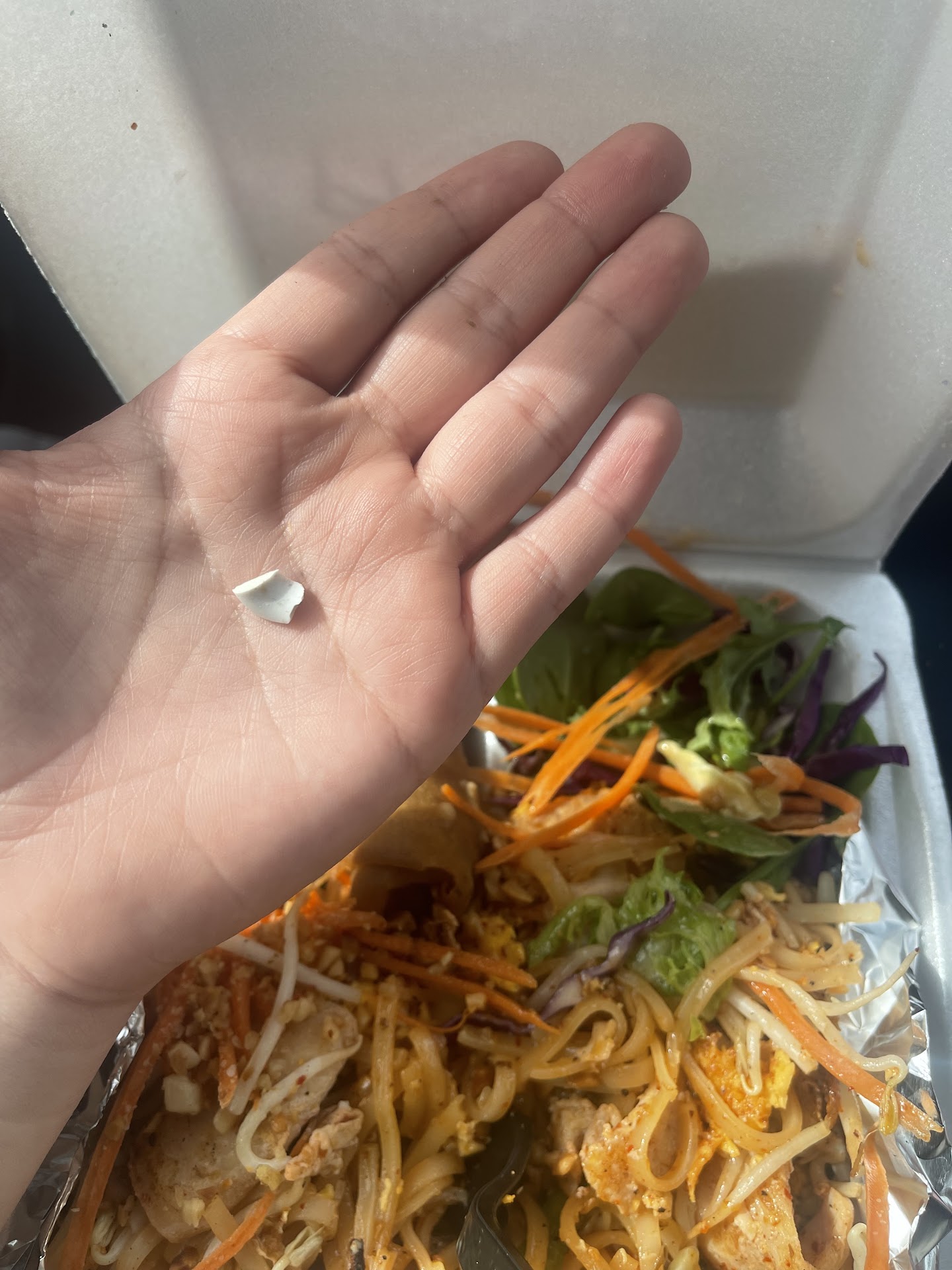 First time trying this place, and let me tell you the food is definitely good. But as I was eating the yummy salad I bit down and felt a hard object, I tok the salad out and a little hard piece of plastic or ceramic? Was in the lettuce. I then went to work with the food and kept eating cause it’s that good and I was hungry, just for my co worker to tell me it happened to her too, but hers was a clear piece like glass.