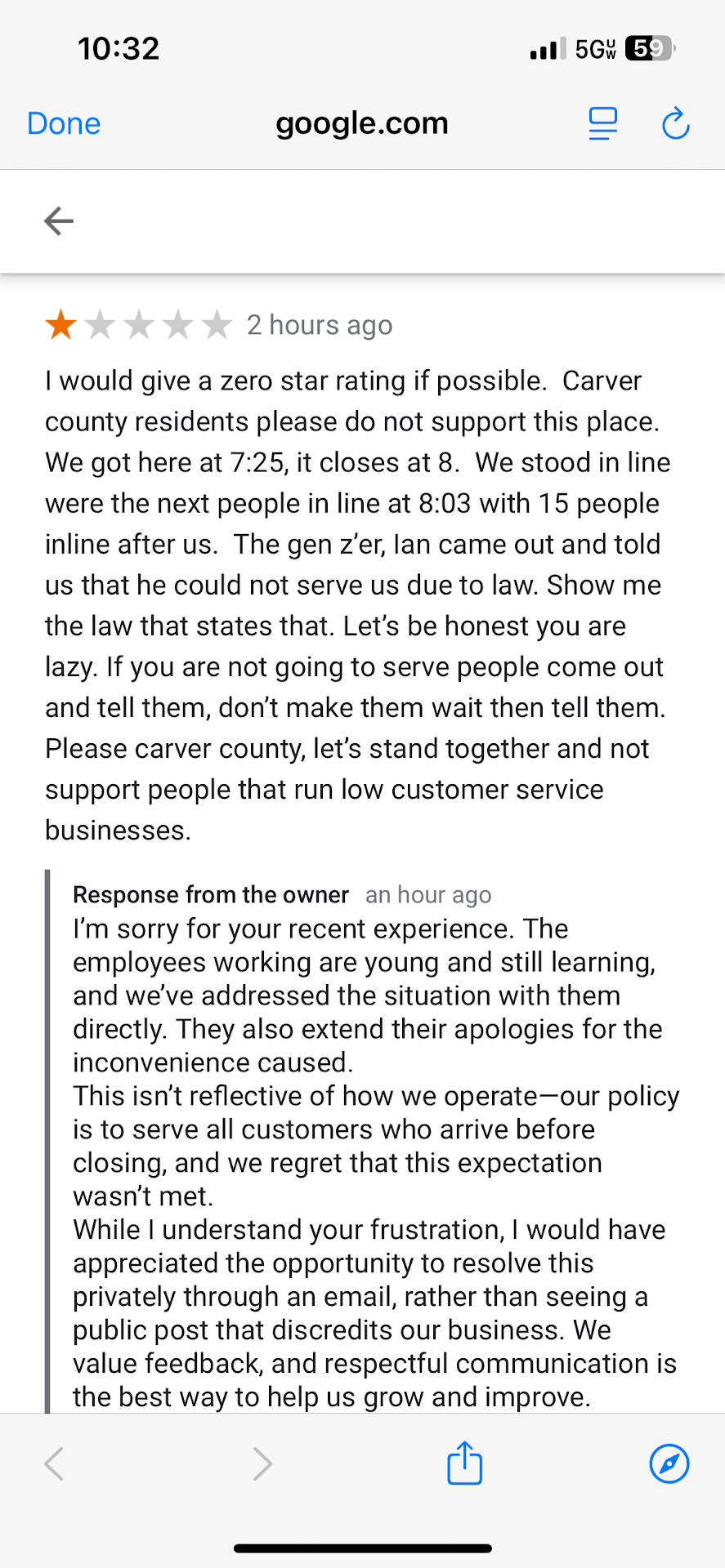 I would give a zero star rating if possible. Carver county residents please do not support this place. We got here at 7:25, it closes at 8. We stood in line were the next people in line at 8:03 with 15 people inline after us. The gen zāer, Ian came out and told us that he could not serve us due to law. Show me the law that states that. Letās be honest you are lazy. If you are not going to serve people come out and tell them, donāt make them wait then tell them. Please carver county, letās stand together and not support people that run low customer service businesses. Update: I got the response in the photo from the owner. They do not care about ruining a customerās experience on Motherās Day. They want the customers to discreetly manage their business. What they care about is that I posted a bad review about a real experience. They want the customerās to coach their employees and not let anyone else know how they run their business. I am sorry, I love to support small businesses that are trying their best but clearly these people...