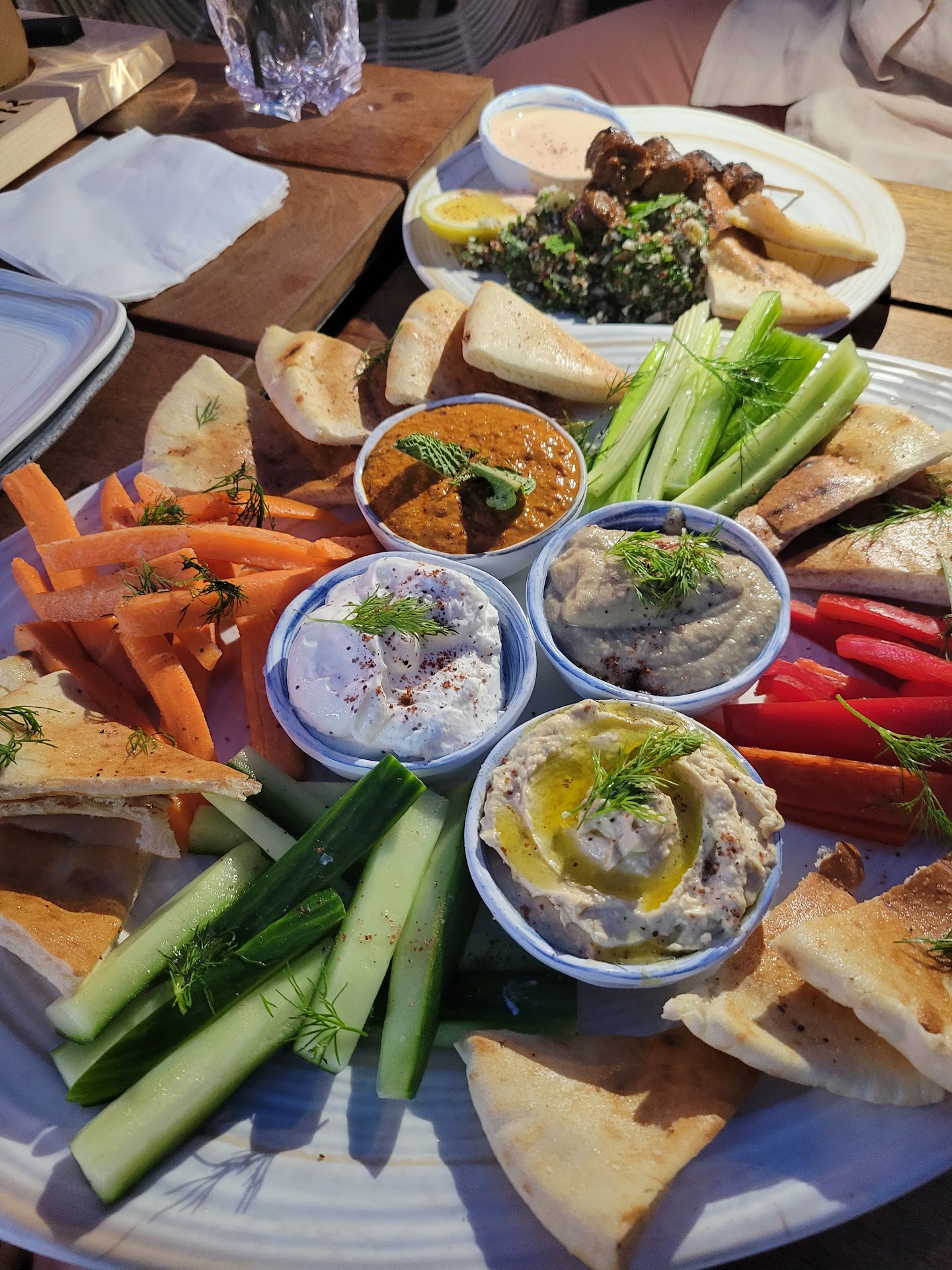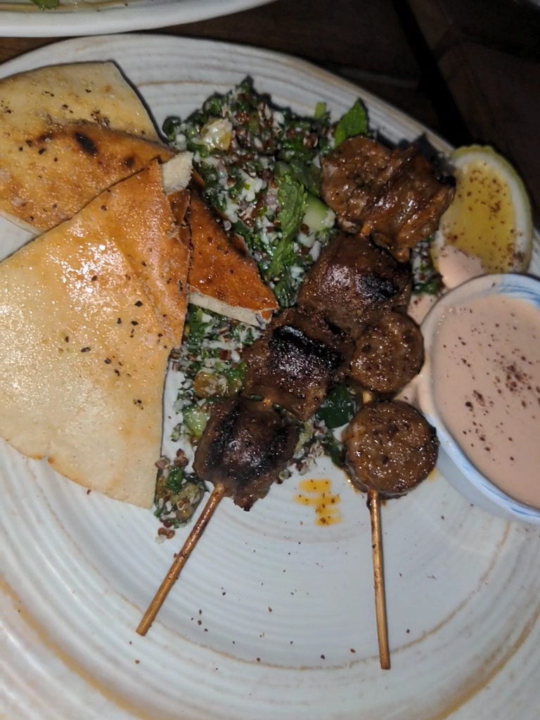 Read moreFirst off I want to admit my fault in the awful experience I had. I was expecting to have dinner and drinks but this is definitely a bar with "upscale" bar food. The concept is nice on paper but the vision is poor executed. Before I get into the drawbacks I hit a few highlights first. #1 parking is a breeze and the area of town is nice. #2 the atmosphere is nice a quite for a bar. #3 our waitress was pleasant. Now for the cons. #1 signage is poor and it was difficult to figure out where to enter the building. You go through another bar downstairs and take an elevator which is more like a service elevator because it took forever and when it did finally come their were two employees on it with a huge trash bin. Luckily the bin was empty or we sure would have left right away. #2 there was no one at the host area to greet us and it was very stuffy #3 the seat can't be to code all the tablets were super low and where we sat felt like being sat at the kid's table at the family gathering. I'm 5'7 and the table was resting on my legs. #4 the drinks were blah, flavorless and too sugary #5 the food was blah as well the grilled pita was cold and the $19 dollar lamb sausage kabob plate was nothing special but I did like the cauliflower tabbouleh #5 there is an area that is still under construction but it is not sectioned off at all Overall this was a horrible first impressions and I will likely not return unless it's a private event with outside...