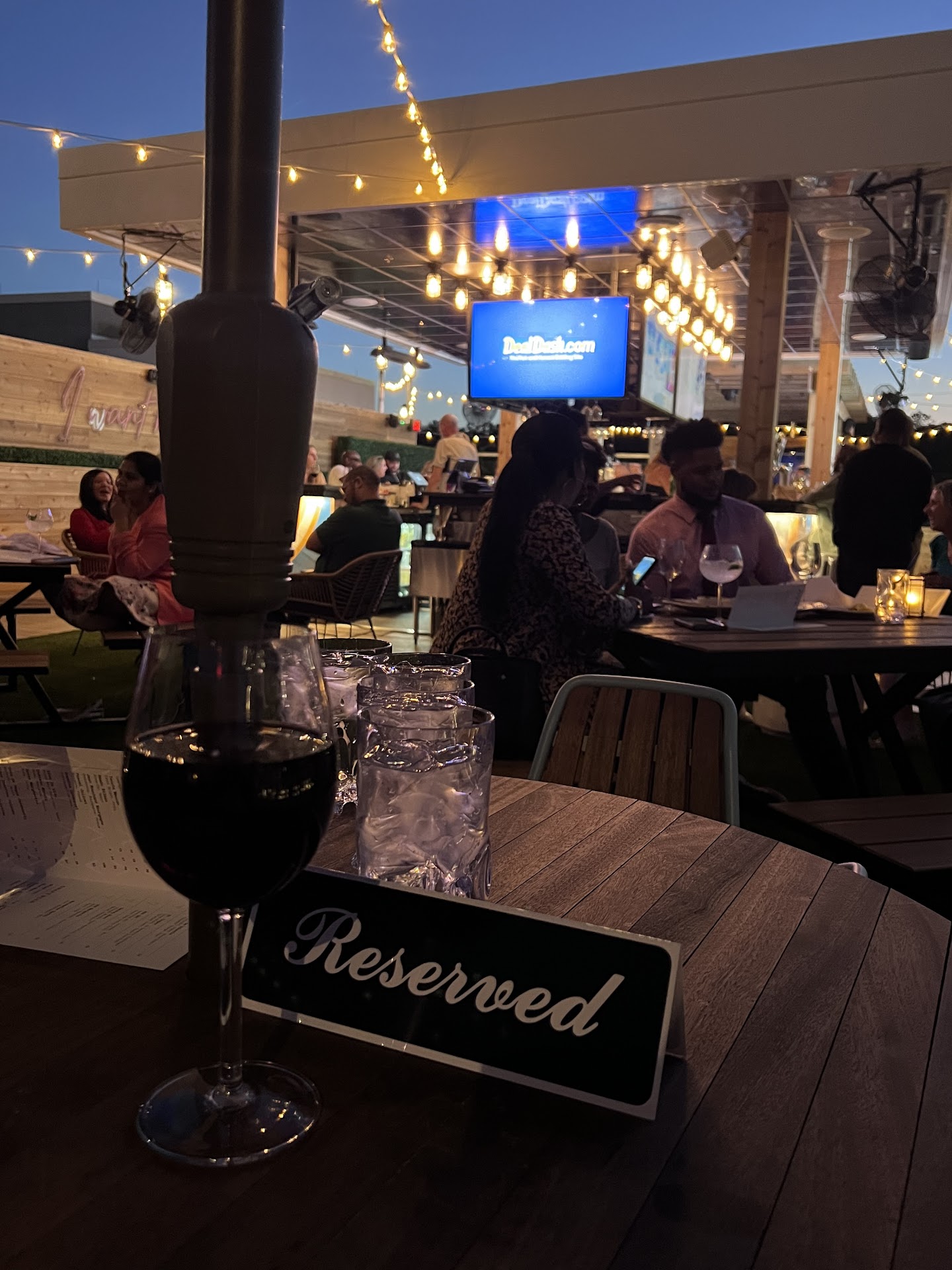 We were able to get seats at the bar at 8pm on a Saturday, with nice open air. The music playing was a strange collection of pop, old rock, latinx pop, hip hop, and rap. It felt like the music was trying to cater towards everyone - but at the same time, no one. Service was difficult to evaluate because although people were sitting at tables and sitting at the bar, people were treating it like a night club and trying to squeeze between people sitting at the bar to order larger numbers of drinks. The bar didn't have olive juice to make someone's martinis and they ran out of blood orange juice for one their signature cocktails, but then we saw them restock the juice maybe 10 minutes later and the bartender never told us it was back - weird? The TVs were also playing several different golf games? I understand they are aligning with their off-brand BW3 vibes, but if the rooftop bar is trying to be an upscale experience maybe try not to cater to the finance bros with 8 TVs playing golf.