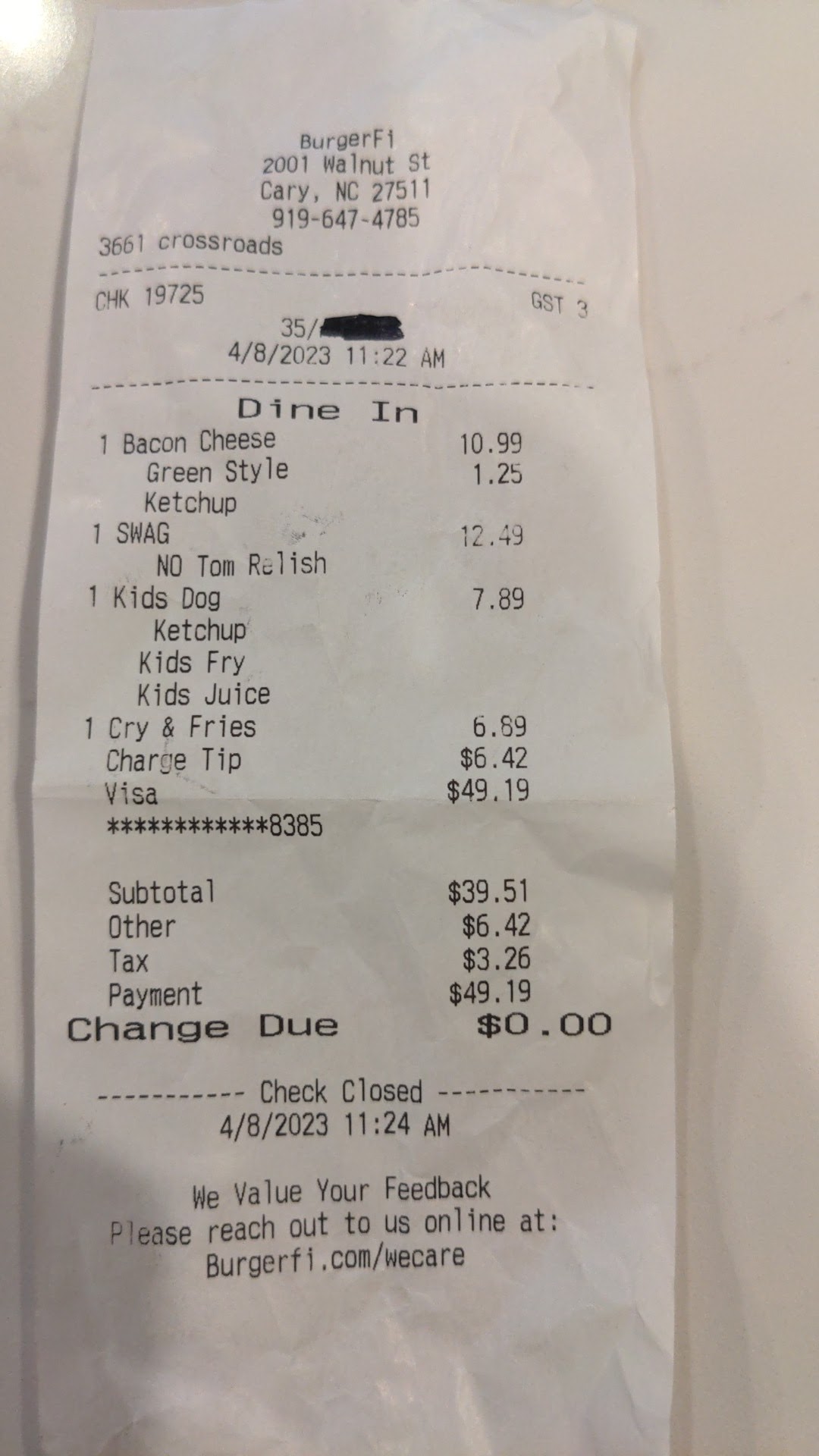 Read moreFamily arrives and the restaurant is slow. Place order for $50: two burgers, kids meal, and order of fries + onion rings. Reasonable wait time for a QSR, but fries arrive cold. My son eats two of the three onion rings so when I ask for a replacement, I say only the fries are needed instead of a full order remake. 5min... 10min. Wife asks up front, with no other customers in line, about the remake order status. "Coming right up" is the response.