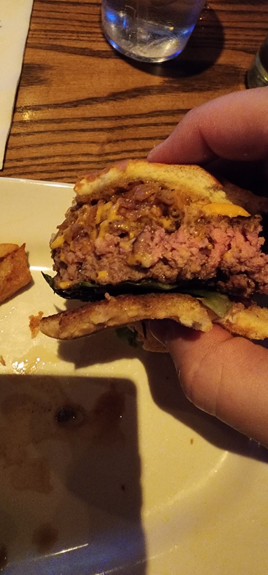 I reluctantly told her to just leave the food, and when I tried the fried pickles the skin of them was like thin chewy leather. After I finished that, the burger itself was medium on one side... but the other was well done. Eventually I got to the fries and at this point they were ice cold.