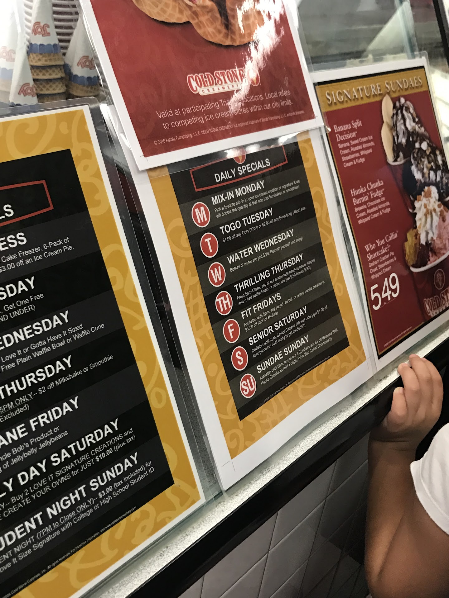 Read morePay attention to all of the recent negative reviews - they could not be more accurate. I wish I had before stopping here. Customer service is beyond HORRIBLE. I stopped in today and was flabbergasted by how dirty the place was. 2 girls were working and not one said hello. They looked truly disgusted to be there and their attitudes proved that. I was bringing my son in to celebrate his honor roll report card. We ordered our treats and I was talking while she was making my sons so I did not look at what she was doing. As she went to make mine I looked over the counter and saw what a minuscule amount of toppings she was adding in - literally the least I have ever seen added in when having ice cream at a Cold Stone before. I asked nicely if she could add just a tad more - so she did literally that (about half a spoon full of graham cracker crust). I just ordered the SAME concoction at the Apex store a week ago (a million times better of a location) and for the one I got they put caramel on the top. This girl did not so I asked if she could. She puts a little on then goes to ring it up - charging an extra $2 for the little bit of extra she added. I told her that I had never been charged for just putting the average amount of toppings and she said "well nobody has ever charged you right". She literally MADE ME ANOTHER ONE WITH EVEN LESS THAN THE FIRST ONE AND THREW AWAY THE FIRST ONE WITH THE "EXTRA" TOPPINGS!! Just tossed it in the trash. It was so very wasteful and just beyond ridiculous. My son goes to sit outside and eat his and he said there was next to no toppings in his either. So, it was dirty, horrible customer service AND wasteful. AVOID and just drive out to Apex or another nearby one. In 10 years of visiting Cold Stone I have never had an experience like this. The manager needs to really get on this as the employees are running it down. If there is a short dark haired girl working...