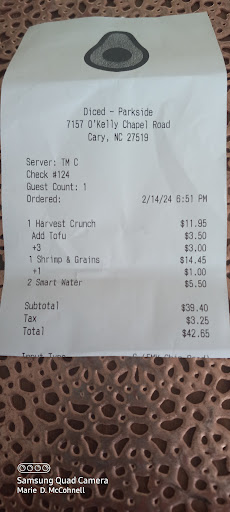 Read moreThis was a definite "try it you might like it" dining experience! Therefore, I invite you to do the same! My friends and I decided to go to this casual salad bowl restaurant for location convenience, instead of driving 15 minutes more to our absolute favorite similar menu place. Two of my friends also wanted to purchase extra bottles of a particular dressing that they loved the last time they were there. I am personally sorry we did not drive 15 min more to our favorite restaurant and spend $15 for each bowl plus drink, instead of at DICED! The environment at DICED Salads was clean and the salad ingredients were neatly presented. The salad staff was polite enough and prepared a nice-looking fast-food salad. The young woman who cut up the greens was amazingly professional at her job. She could weld that salad cutter and mix that salad with amazing speed and precision. Now you should know that my friends liked their salads and loved the dressings. My lower food rating was because the cost of adding a little extra topping cost $1 to 3.50 each; for very small portions. Secondly, my salad had no real taste of crisp freshness nor did it have a true "green lifeforce energy" to it! It had that straight-out-of-a-plastic-bag kind of energy and taste in my opinion. You know how wonderful your body feels when you eat a healthy fresh salad... well that feeling was missing for me! The blue cheese dressing had little blue cheese in it and was not interesting to taste. The roasted veggies were bland too! I am very particular about having good-tasting food since eating out means, almost always, that I have to give up on having organic foods. I do like the taste of fresh flavorful veggies and toppings and therefore, I did not like spending that amount of money for the DICED Salads. PS. I did try to eat the leftover salad the next day but, no, still did not like it...put it back in the frig thinking maybe I would like it later in the afternoon, and it is still there. Disclaimer: Again, it could have just been that my tastebuds were off, however when I ate the fresh hot homemade butter squash and chickpea curry that I made later the next day, it...