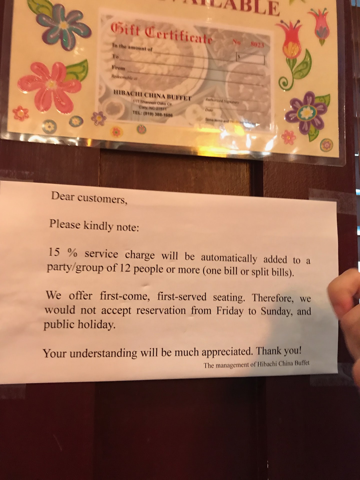 Read moreI rarely post reviews, but feel compelled to do so this time. This was our 2nd time eating here (1st time was no issues, over the winter). After having some egg noodle soup (tasted good), I went up to the hibachi station to choose my options, and handed to the cook. While waiting a few steps away for him to cook it, some movement caught my eye on the item bar to the left (where I had just picked out my rice, onions, zucchini, and raw chicken). It was a roach crawling across the edge along the back of the frame (he had come out from the edge along the back). Another came out and boldly walked along the front, and by this time my husband walked up (he had already eaten his selection while I ate soup first)âŠso I pointed the quite calm and non/fearful fellow out to my husband. The chef handed me my cooked meal..I went to my table where my other three adult kids wereâŠand of course didnât eat my selection. They were by that time almost done with their second plate đ©. I went and asked for the manager, was pointed to a lady manning the front desk (behind the lean on the left). I explained what I had seen, and walked to the hibachi section to point out the location quietly (the brave roach fellows had seemingly grabbed a bite and had retreated behind cover to enjoy their meal). The manager apologized, saying that humidity has been a problem. The full bill came, and I asked the waitress to speak with the manager as I could not eat anything beyond the soup because of an incident I had made her aware ofâŠthe manager allowed the removal of my meal cost. I paid for the other 4, tipped appropriately (waitress service was great). and proceeded to exit the building for the last time. Will not return. Service good; but canât handle roaches...