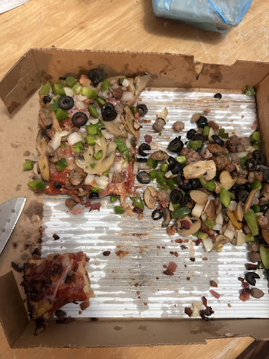 Moreover, upon inspection, one half of the pizza (bacon, pineapple, Canadian ham, and beef) was burnt, while the other half (supreme) was excessively topped in a manner that appeared rushed. The toppings were so poorly distributed that they slid off when we attempted to serve the pizza.
