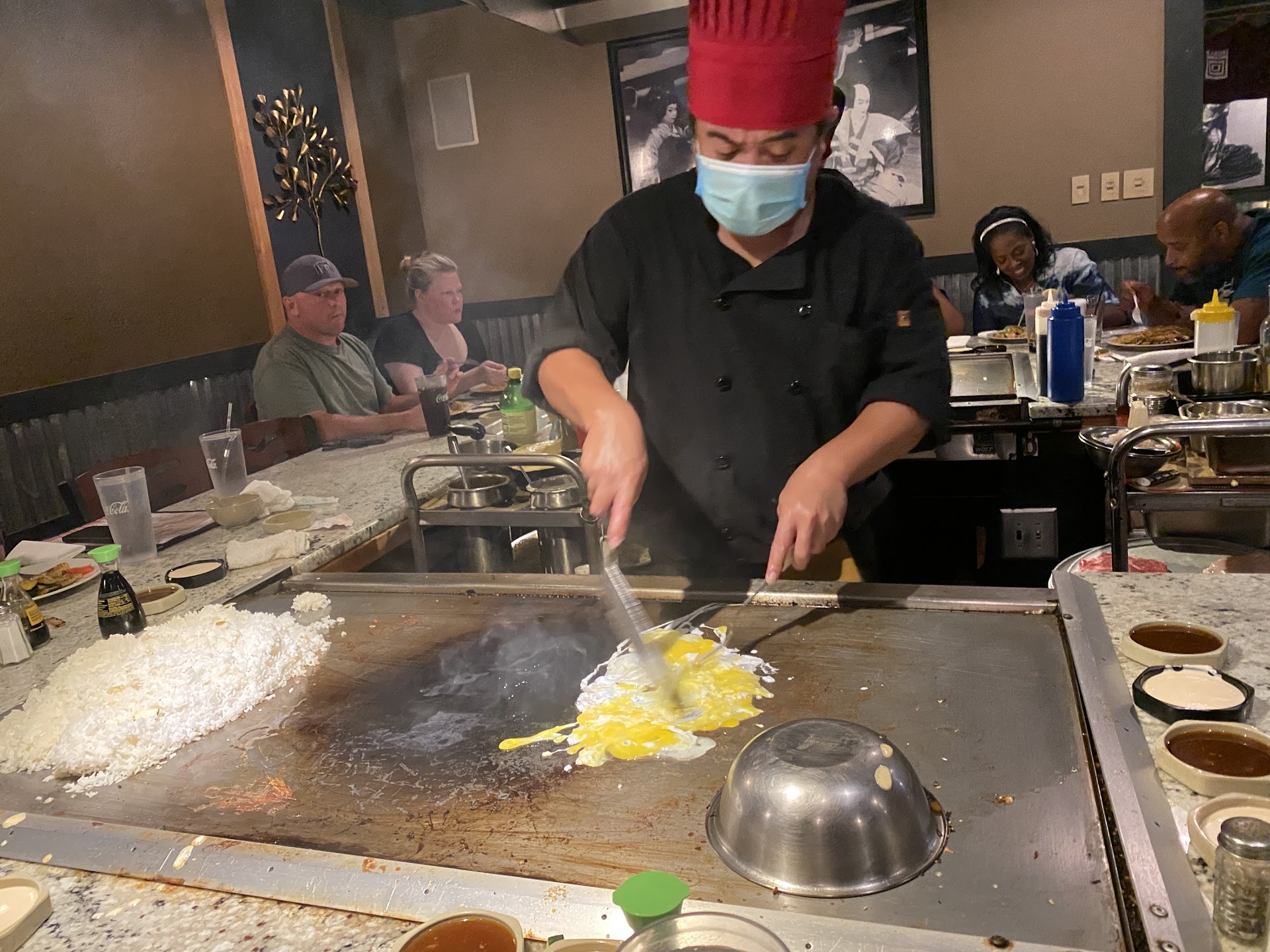 I don't know if it was an off day for this guy, but I have never been less impressed with a teppanyaki chef than I was this day. He came out, and there was no big flame like they usually do. He had a fire on each end of the table, small, and that was it. No banter with the guests. No juggling or anything with spatulas. No egg tricks. Nothing. He then cut the onion and did the onion volcano trick briefly, THEN lit the fire on the volcano.