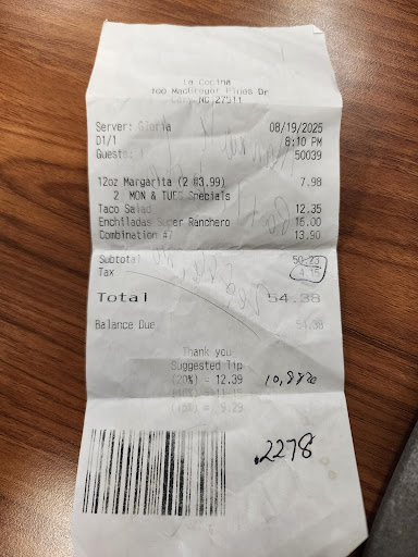 Read moreFeel like celebrating Cinco De Mayo, Las Posadas, or Un Feliz Cumpleaños? Come to La Cocina!! There are 11 locations to try, so if this one isn’t convenient enough for you to visit, check out their website. The restaurant is huge and makes you feel like you are transported to Mexico with the atmosphere and pleasantry of the employees. It feels like you were invited into someone's home and given a heartwarming dish. The margaritas are giant, and the alcohol-to-mix ratio is perfect. Not too strong and will hit you just right to want more, so be mindful. Their housemade salsa and guacamole is freshly made, so you’ll want to keep snacking! I ordered the shrimp burrito accidentally and the shrimp was grilled, but there wasn’t anything else stuffed in the tortilla, so it fell short for me. The Mojarra Dorada was fried well, so it was still moist and succulent. They lightly coat it in a spice flour, so you’ll still taste the fish. Lastly for dessert we had the fried ice cream in celebration of my mom’s birthday. They use corn flakes to coat it and the mexican vanilla ice cream was rich, creamy and if I could buy a pint I would in a heart beat because it was so...