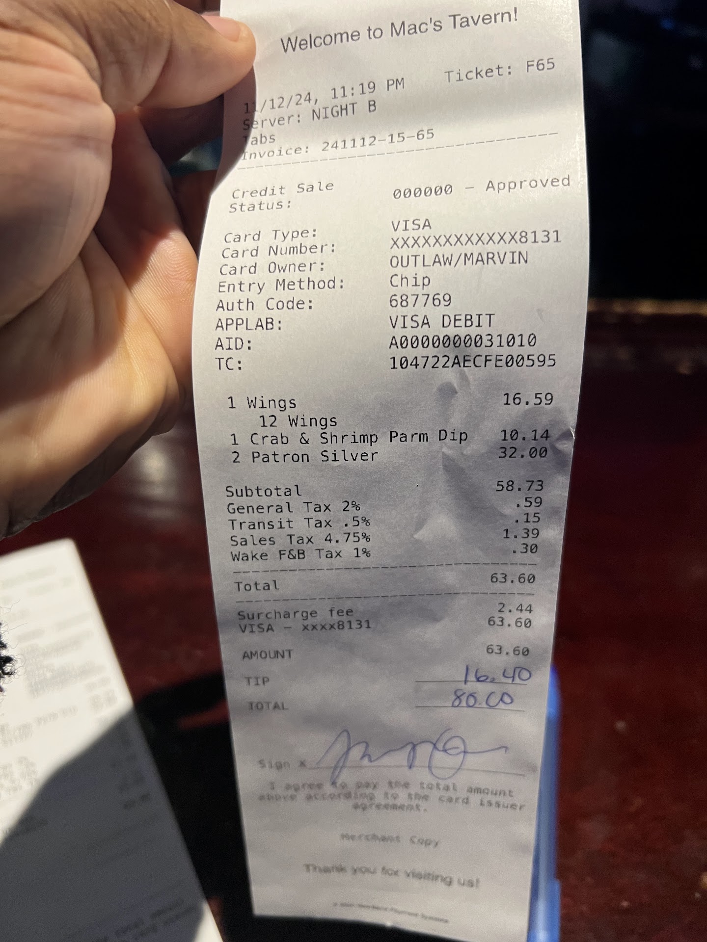 Read moreI wanted to go out for a nice quiet night. I wanted to hear my favorite country hits. I wanted good food and great drinks. I found it all at Mac’s. I was greeted by a very outspoken customer as I entered. He told me to let him know if I had any problems being helped and he would take care of it for me. I thought maybe he had “one too many”. I quickly saw what he meant. The bartender served everyone except me. In 2024, I would hate to say that it was a racial thing and refuse to berate my awesome experience due to one person’s preferences/limitations. She was kind enough to get someone from the back to help me and she was super kind, knowledgeable, and courteous! My drink was perfect! They have the TouchTunes software (which is what led me there) so I was able to play the music that I wanted to hear! I ended up getting my food (medium buffalo wings and crab & shrimp parm dip) to go! Some of the best food I’ve had since being in the triangle! Wow! I ate it so fast, I didn’t even get a chance to take a picture. It was very reasonably priced. I will be back! I hope that’s...