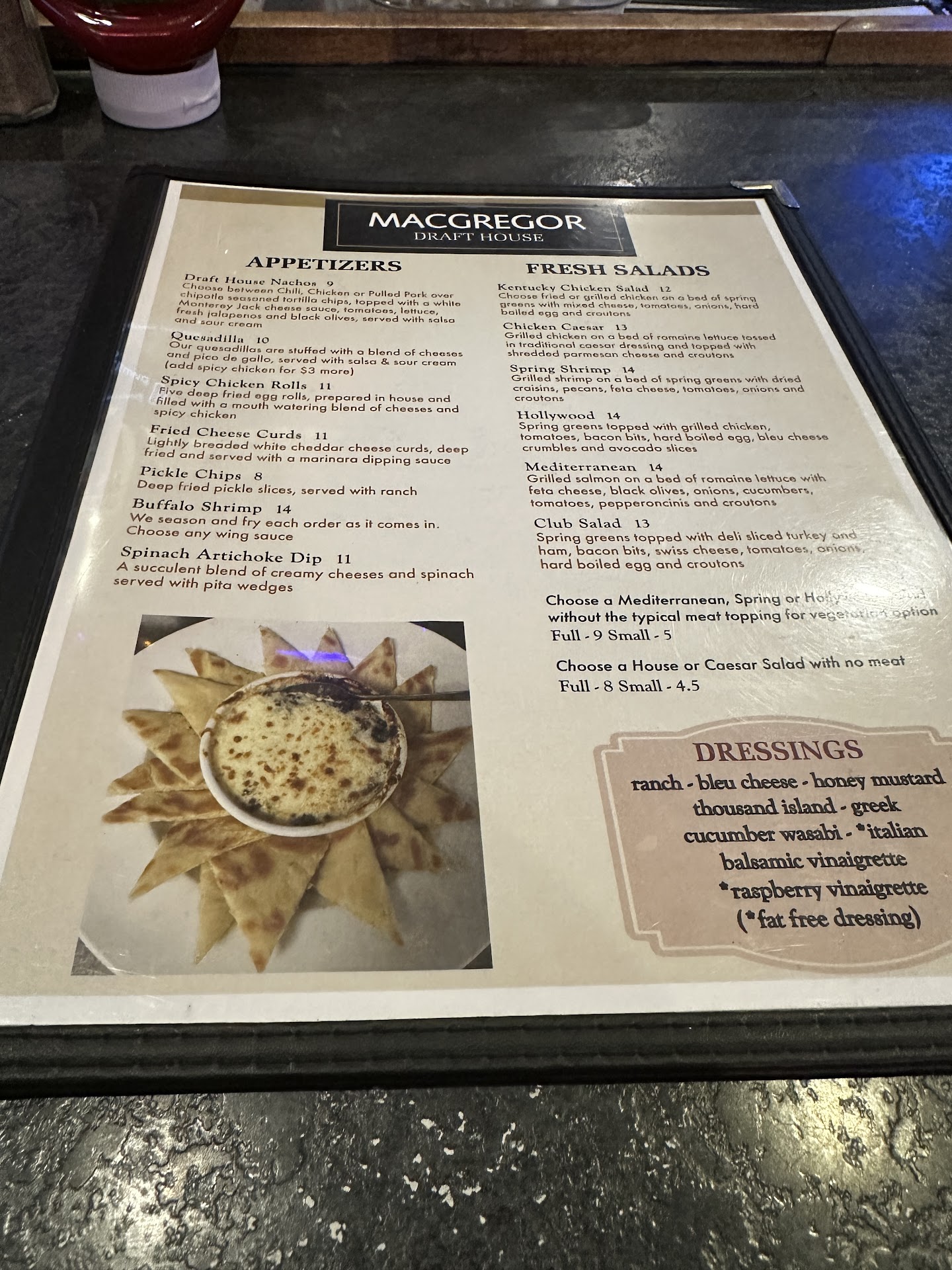 Read moreThis place came highly recommended by family and friends, and I’m sorry to say the praise was very unwarranted. We arrived around 6pm and didn’t mind the short wait time to get a table . After some time we were sat behind a very large party with a clearly stretched thin server . We waited roughly 30 min just to get our drink order , to the hostess that actually sat us at our table . But since we had waited so long we went ahead and ordered our food with her as well . Appetizer and dinner , the standard side with the sandwiches and wraps was chips , and this evening we were told chips were unavailable and we could get fries for no up charge - that was a lie . It was added to our bill . We were told it came with a side of ranch . That was a lie it was extra and added 2 more dollars to the bill .