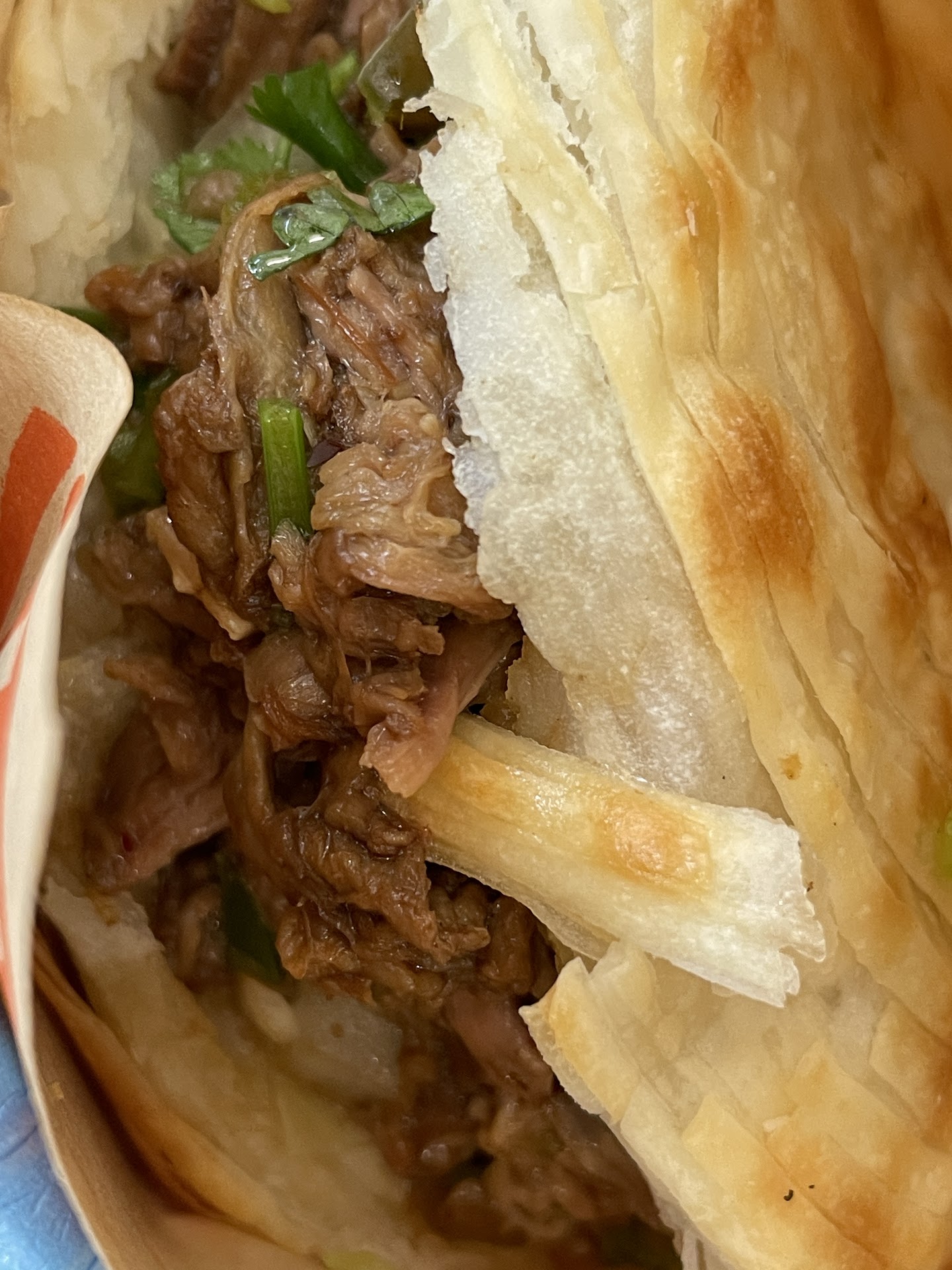 Cons: There were no employees present when we came in; one person came out from the kitchen, didn't look at us while we stood at the counter, and went down the back hallway. We took our food and left without anyone acknowledging us. The youpomian was congealed and impossible to mix when we got home; there was enough garlic to combat a dozen vampires. And look, I love garlic. But between both issues, it was inedible. Xi'an roujiamo usually has a soft "bun" with just meat inside; no vegetables. Their roujiamo is crispy with vegetables -- more like Henan style. That said, it was the best part of our meal. Their cold noodles are not Xi'an liangpi, but liangmian - which isn't local to Xi'an in the way liangpi is. That's more of a personal pet peeve to me, and not necessarily a knock on the quality of food. Missing some key staples, like paomo.