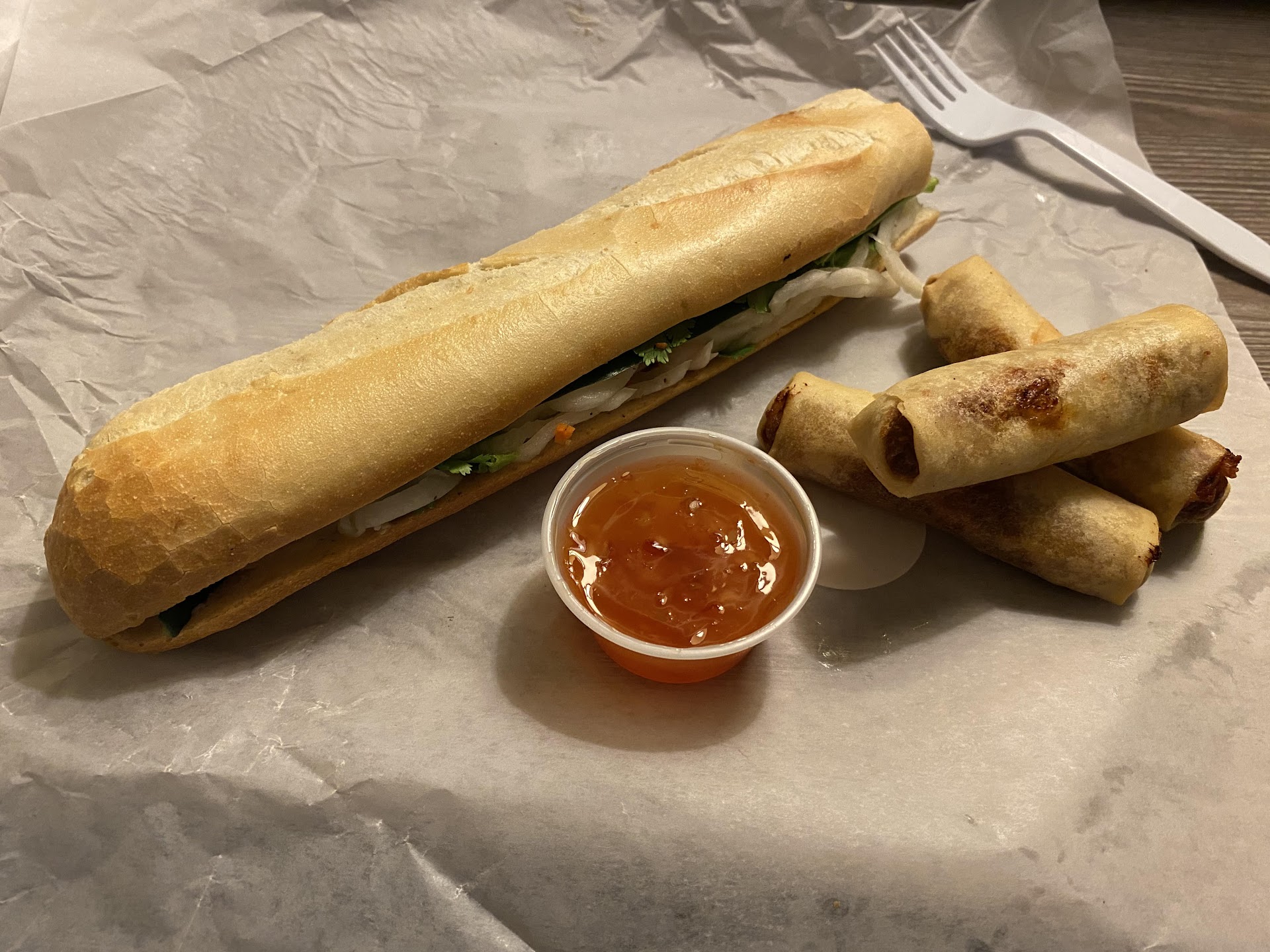 The vegetables were decent and typical for Banh Mi. The bread was dense, lacking the airy fluffiness I'm used to inside, but it had a decent crunch on the outside. If you want better bread, the French-inspired Banh Mi place on TW Alexander stands out without naming names.