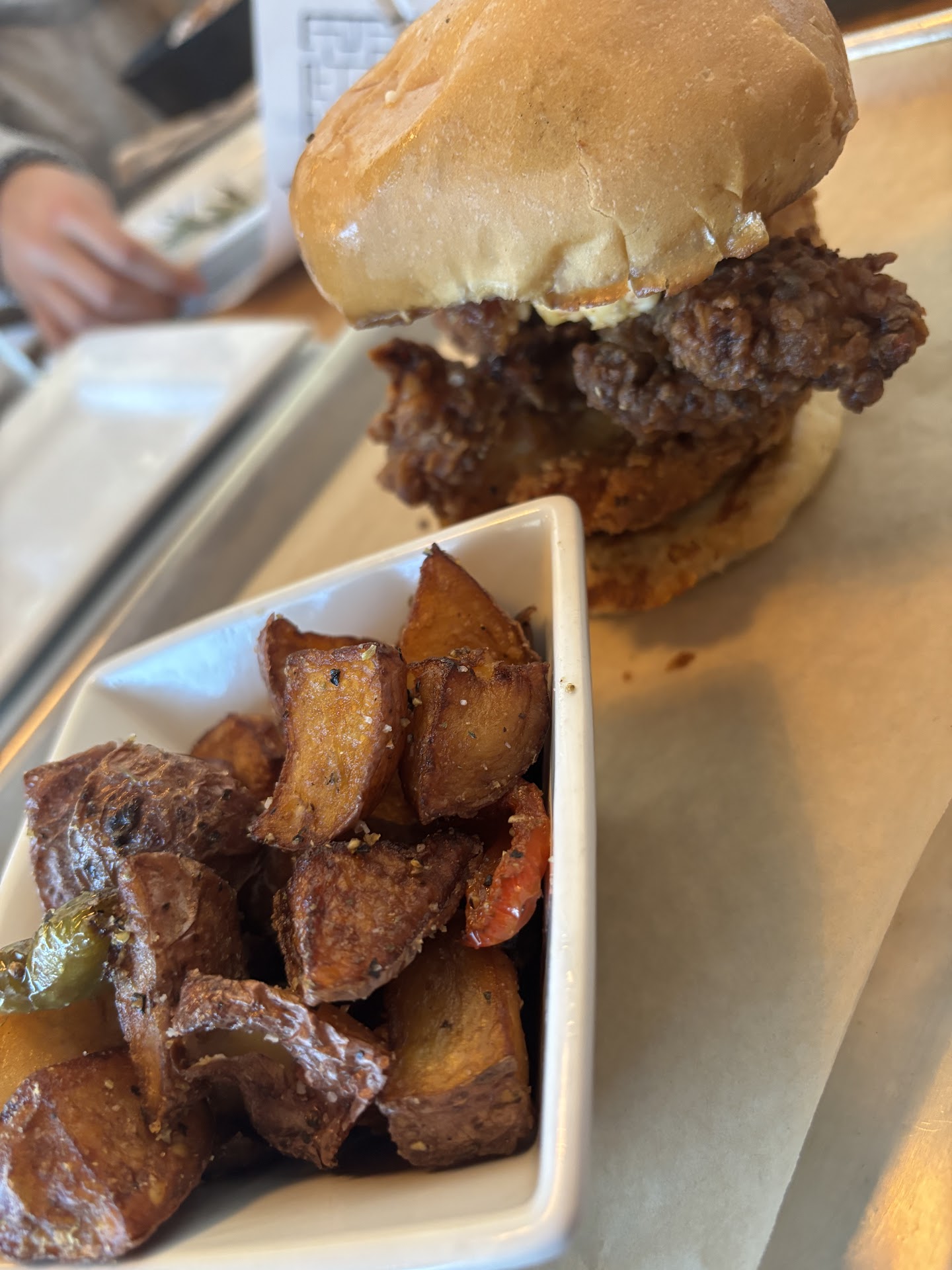 Crispy Chicken Sandwich -Ā Waffle-Battered Fried Chicken with Spicy Maple Syrup Aioli, Candied Bacon and House Pimento Cheese with Scratch-Made Pickles. Served on A Locally MadeĀ BriocheĀ Bun. Ā This waffle batter chicken was perfectly cooked, crispy, juicy and tender inside, and seasoned to perfection. Ā The maple syrup aioli added an outstanding balance of heat and sweet flavors, adding the smoky sweet candied bacon, with the creamy richness of the pimento cheese and the contrast of flavors with the homemade pickles. The dish was the perfect blend of sweet, savory, and spicy to elevate this sandwich beyond normal expectations.