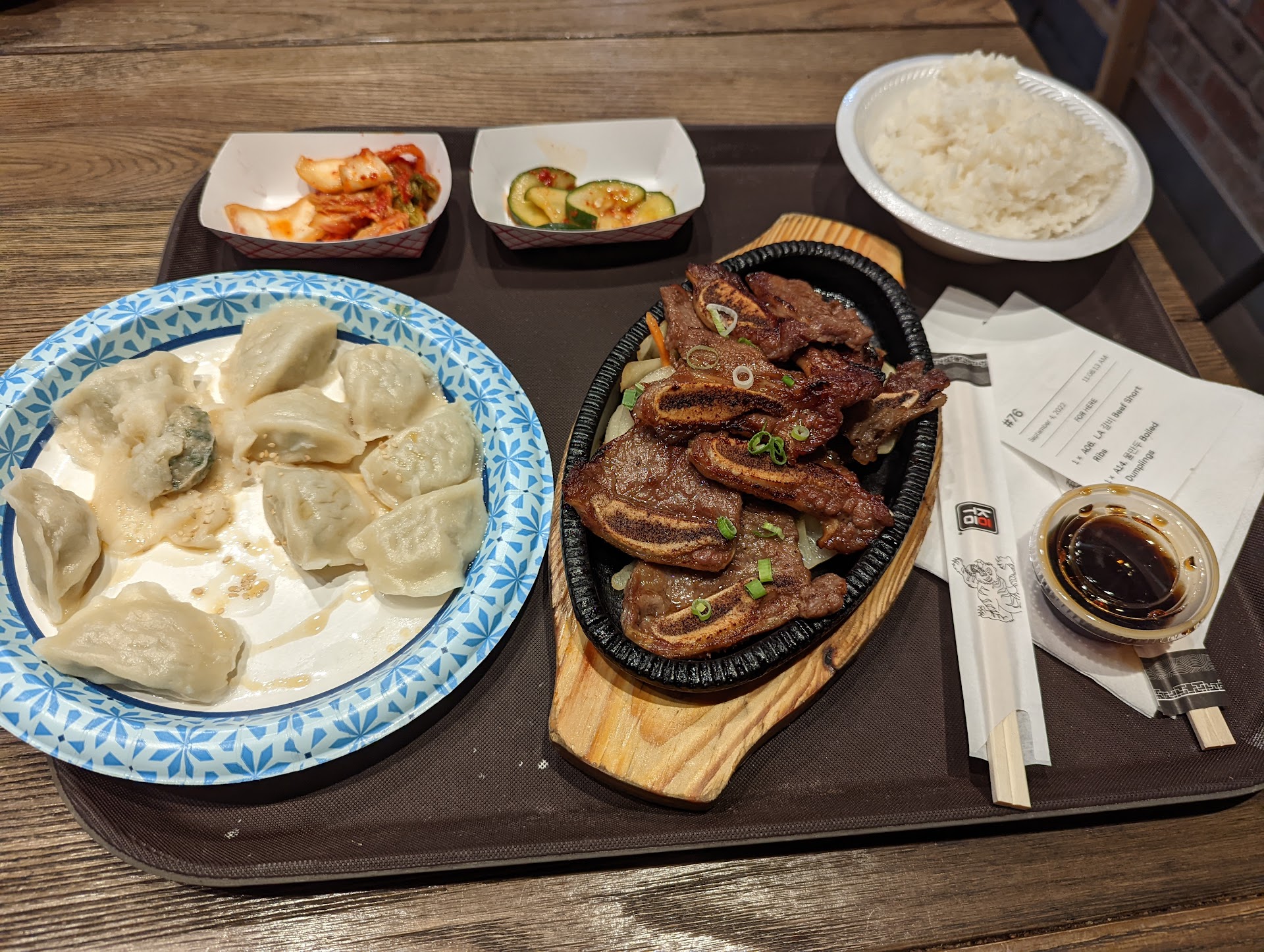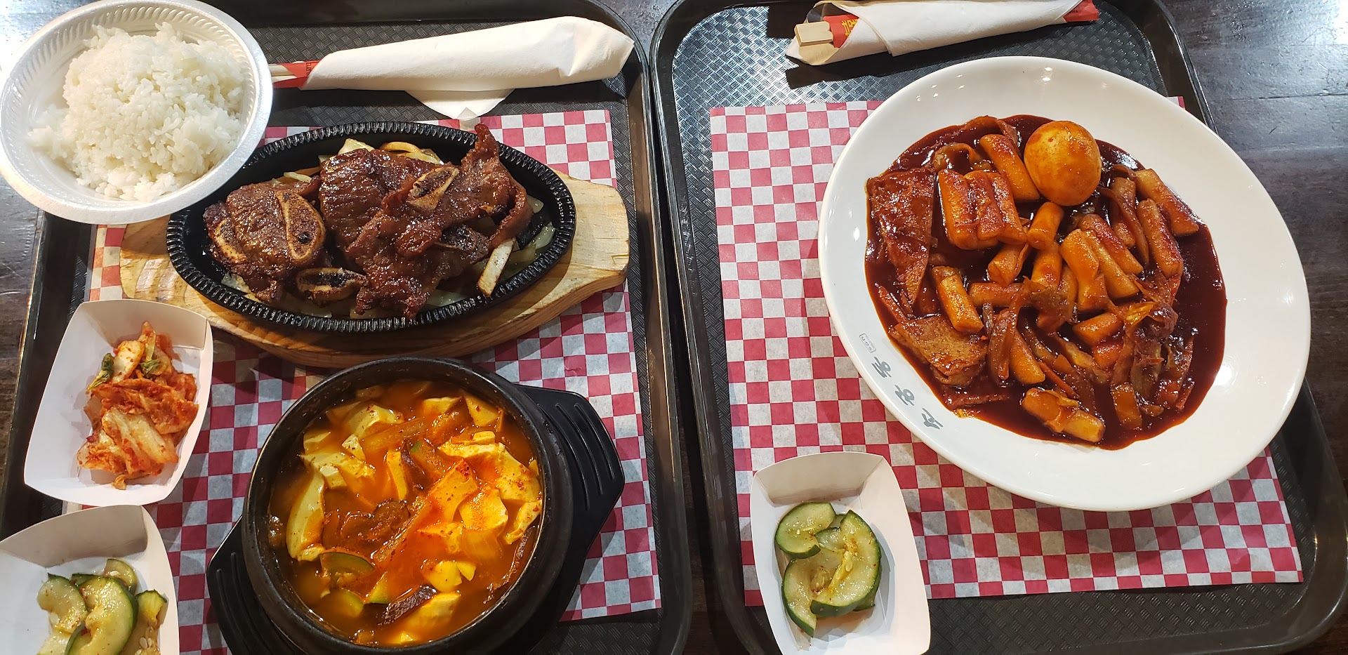 We got the mushroom soondooboojjige with beef short ribs combo and topokki. It was served with one container of white rice and banchan (kimchi and pickled cucumbers). I wish there was a second container of white rice, but otherwise this was plenty of food for 2 people as we also had some leftovers to take home. I wouldn't get the topokki again, but the soondooboojjige was nice. As far as H Mart food court meals go, this one was pretty good.