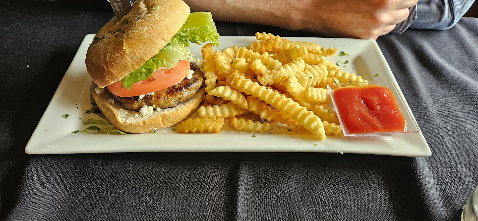 We ordered an appetizer, which was placed on our table with no interaction nor plates to allow us to partake. When we flagged a server over to request plates, she said, "We didn't know if we'd have enough with the event." Our water glasses were refilled once, only after we asked. My husband ordered the Hungarian Goulash, which was flavorful. I ordered the Dalmation Chicken Pasta, which was basically buttered noodles - there was very little chicken and 5 small spinach leaves.