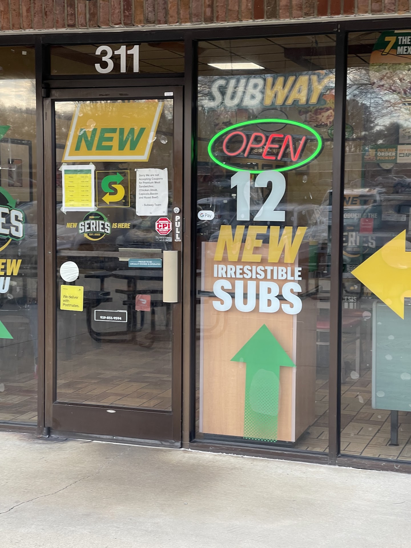 Subway is not my first choice for a sandwich shop, I only came to this one because we had coupons that came in the mail so I said âwhy notâ. The coupon we had lets you get two footlongs for 12.99. We got there realized we had accidentally torn the date so we went back to the car and got the piece that showed the valid date and showed it to the guy And started our order. When we got to the check out the coupon due to being torn funnily wouldnât scan so the guy said we would have to pay full price even tho we had our valid coupon. I ran out to the car to get the booklet in hope of finding the missing piece of barcode and when I got back they had torn up the coupon but seeing the booklet they found another coupon of lesser value and used that one. I donât understand why they couldnât find a way to enter the coupon manually seeing as we had a valid coupon it just wouldnât scan or even just comping the difference. I wouldnât have spent my money there had I known my coupon wouldnât work. Not wanting to waste we paid the extra and left but not only were our sandwiches alright at best the incident left a bad taste in my mouth. I wonât be going back. A visit that would have cost us maybe $14 w/tax wound up costing just abt $20. not a lot of money but its the principle, very...