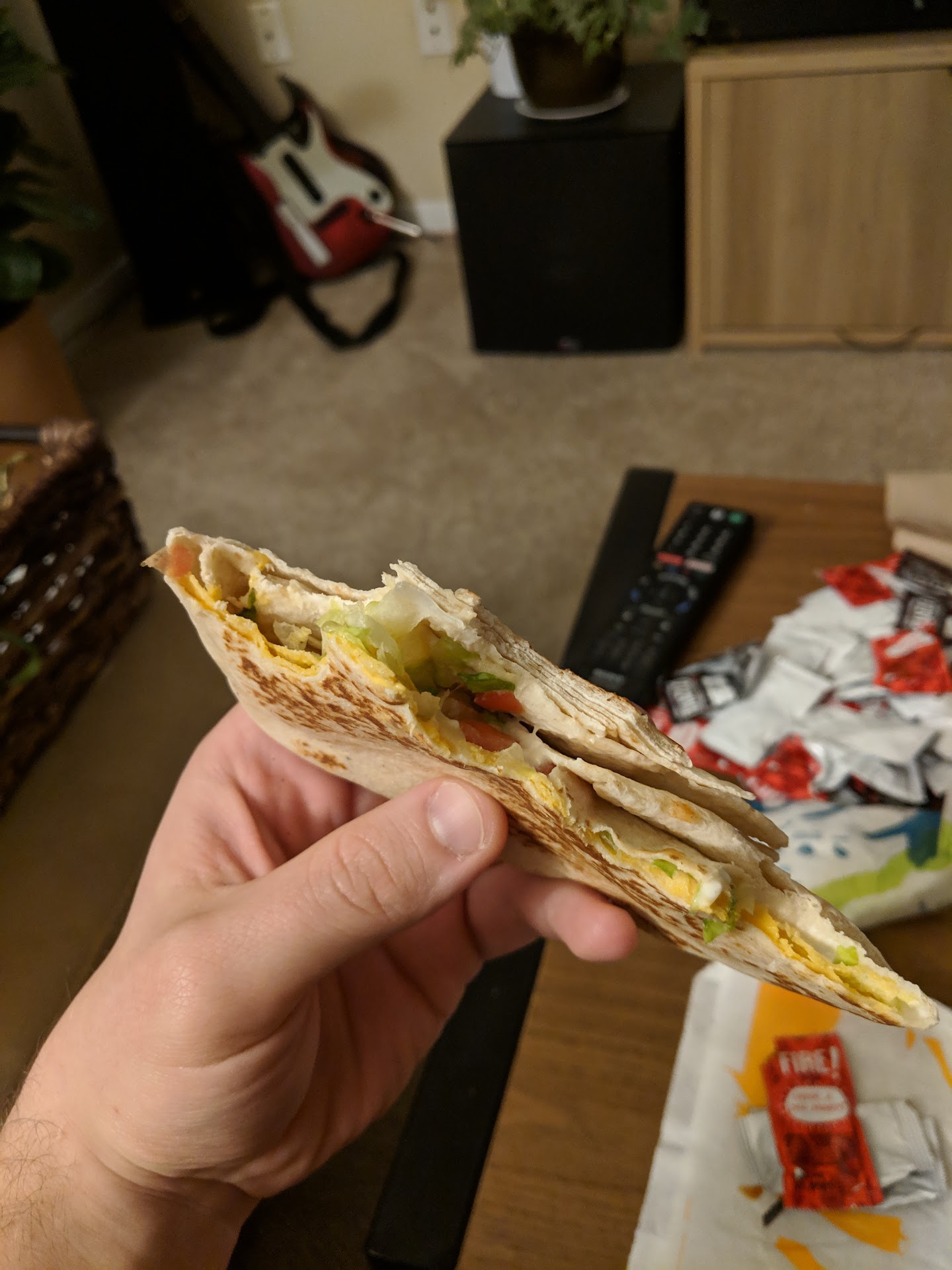 Once we got home (five minute drive) the food was luke-warm if not cold. Many items on the order were either wrong or prepared poorly. For example, the pictured crunchwrap supreme only had lettuce, tomatoes, and sour cream on it. The pictured hard shell taco had gotten soggy by the time we got home and was smashed from having heavier items placed on top. Additionally, several of the items had not been wrapped well and we had a bunch of lettuce/tomatoes/taco meat floating around in the bag.