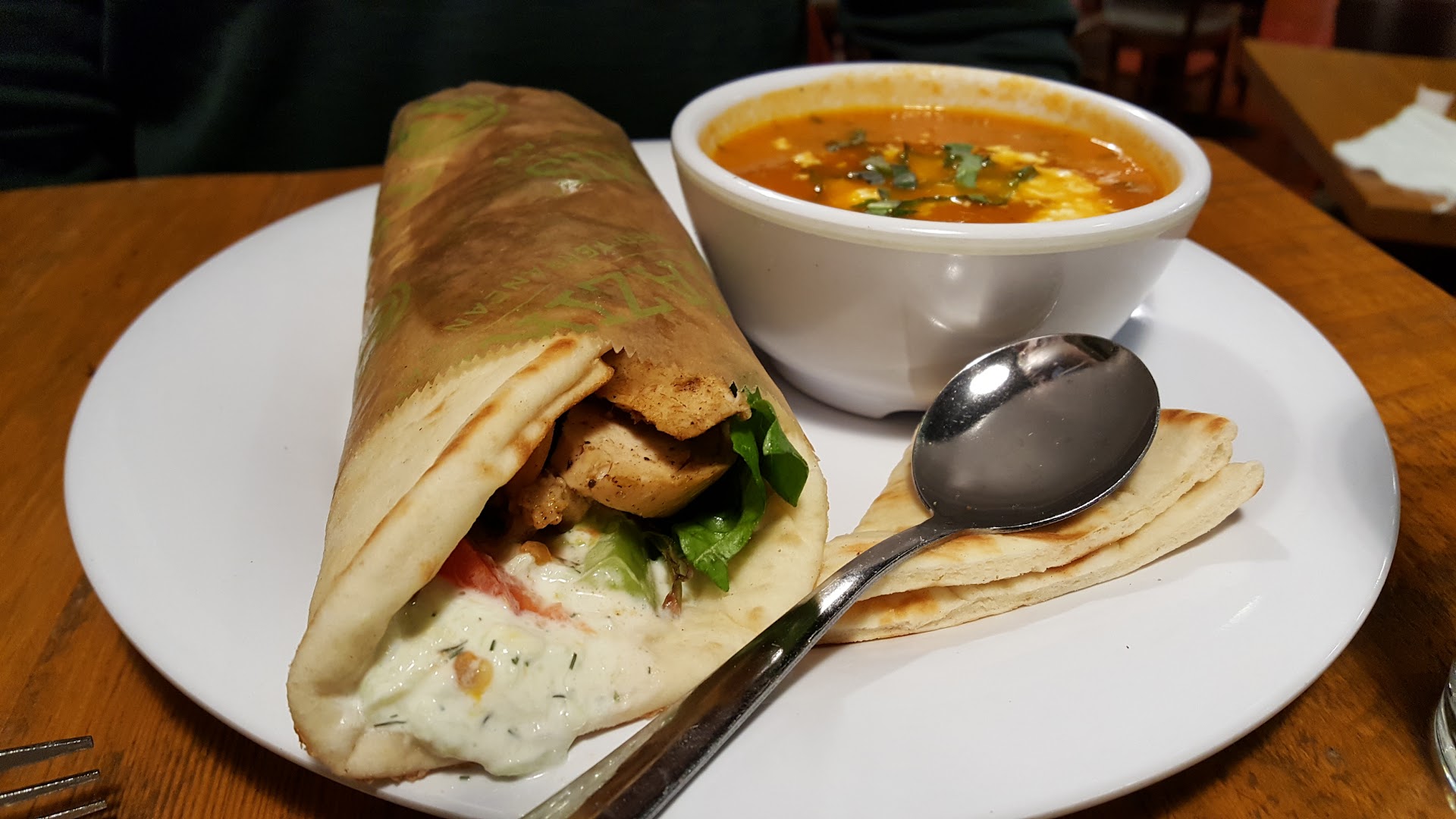 Cons: Everything was absolutely underseasoned. The lamb gyro had little actual lamb flavor and was reminescent of cafeteria mystery meat. For a place called "Taziki's" they're absurdly stingy with it. The beef gyro was better - very tender - but again, underseasoned. The cucumber and tomato salad had pitifully old basil, pale and somehow soggy cucumbers, and tomatoes that tasted like they were harvested months ago. The kid's feast of chicken and rice was decent enough for the toddler - lemony basmati rice and somewhat dry chicken.