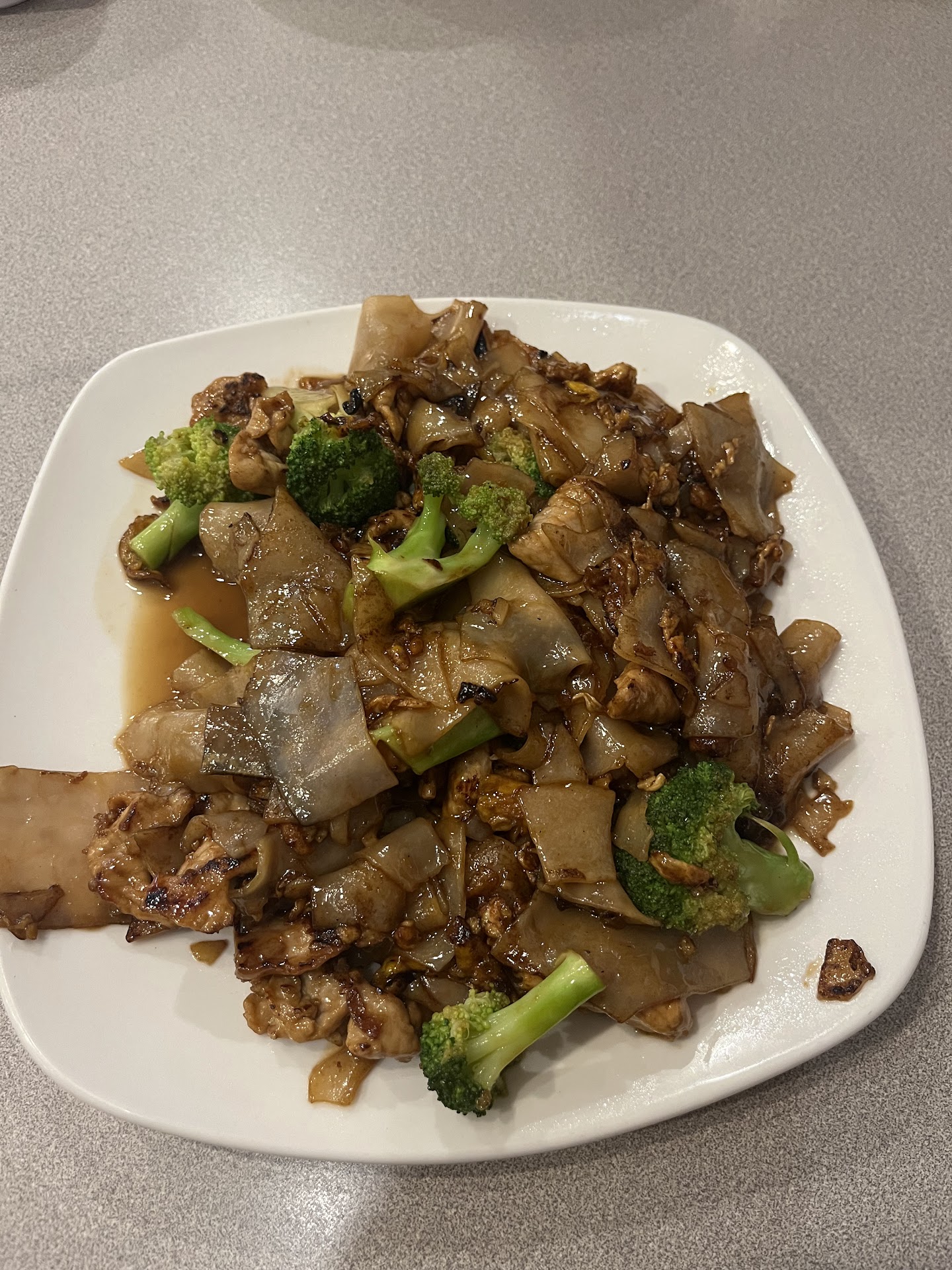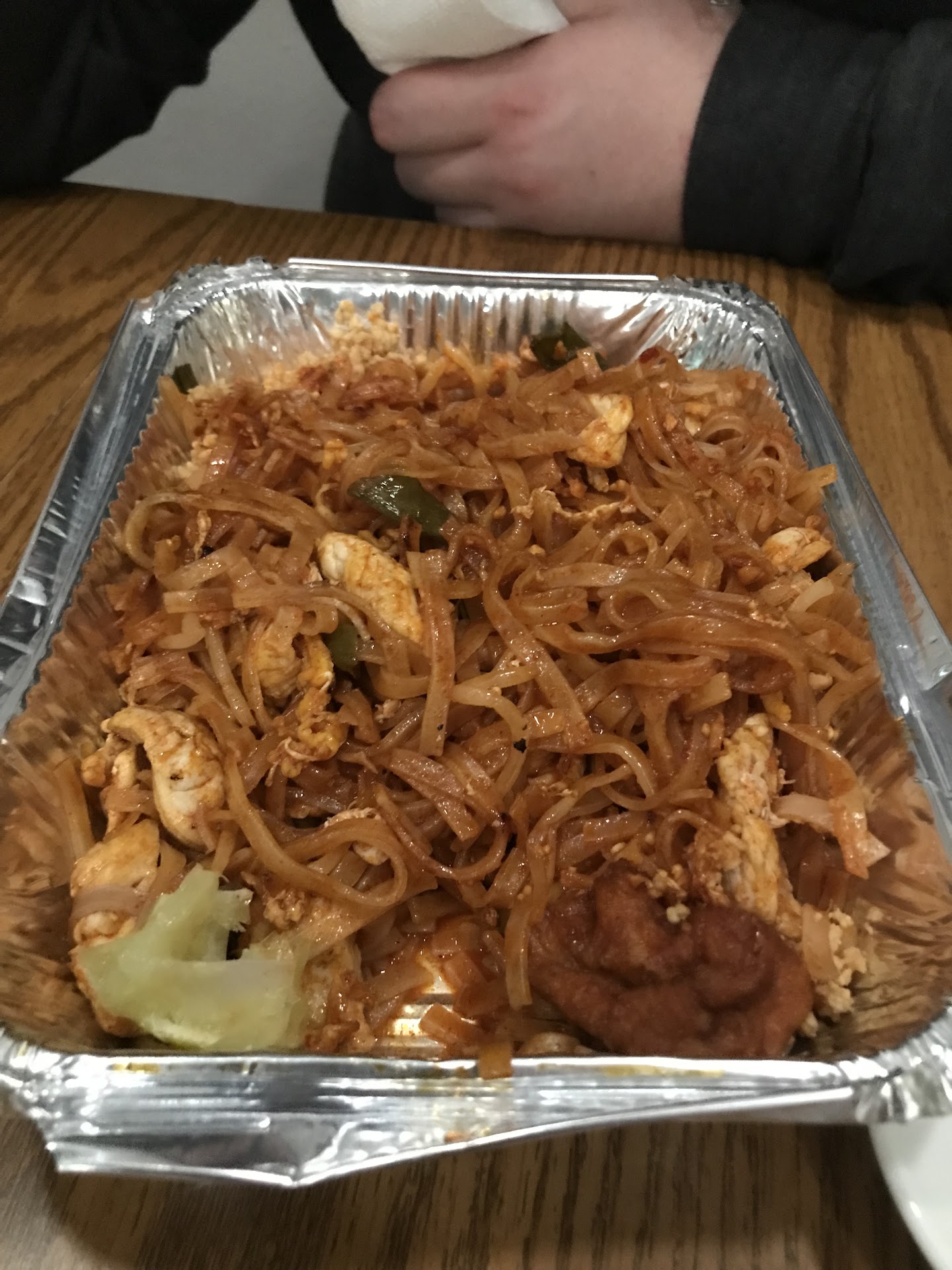Pad See Eww: first thing I saw was wok hay. Wok hay is a very good sign. Some Thai restaurants do not have it even though that caramelization is important to flavor. Great overall flavor however there were some charred bits that detracted from the taste at times. The soy sauce didn't seem to be the sweet sauce I'm used to however it was good. The only thing missing was onion. Onion is not included in the dish but I often add it for additional flavor. The addition of onion is the only thing I would change.