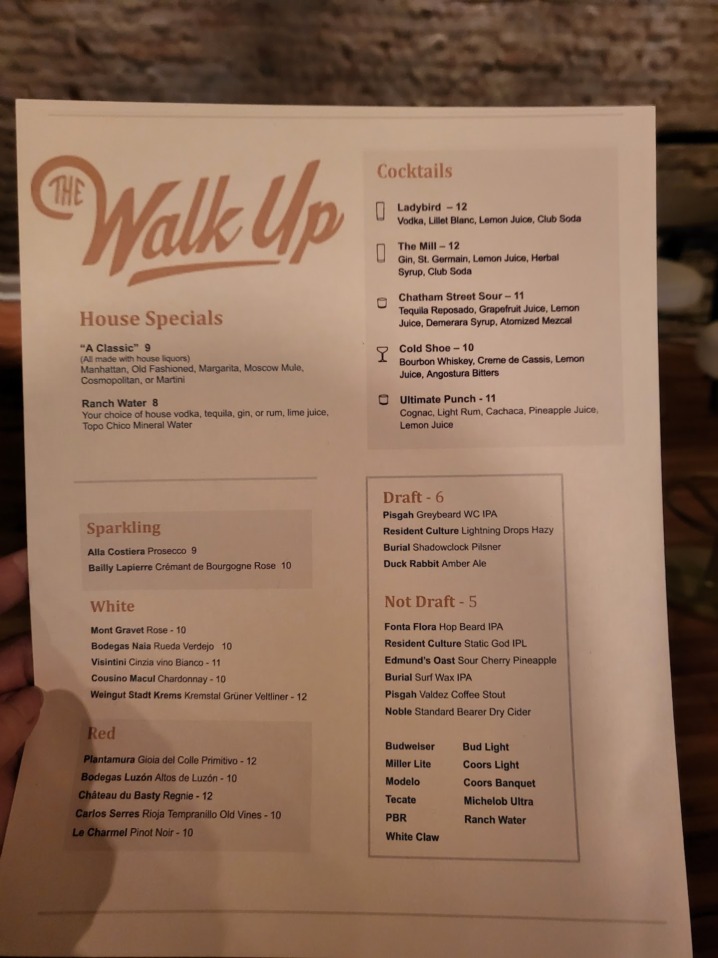 Disrespected and Targeted. This is the experience we had at the Walk Up. A relatively new bartender there (Jen from NY?) is rude, unfriendly, and bad for business. Before we even ordered our drinks and sat at the bar, she had an attitude with the customers in front of us. When my friend asked if she could put espresso beans in the espresso martini, her response was curt. Also, my friend didn't like his drink and asked another bartender (James) to make it as he had made it the previous times we had visited there. She was upset at my friend for not liking it and unfortunately, she made it again.