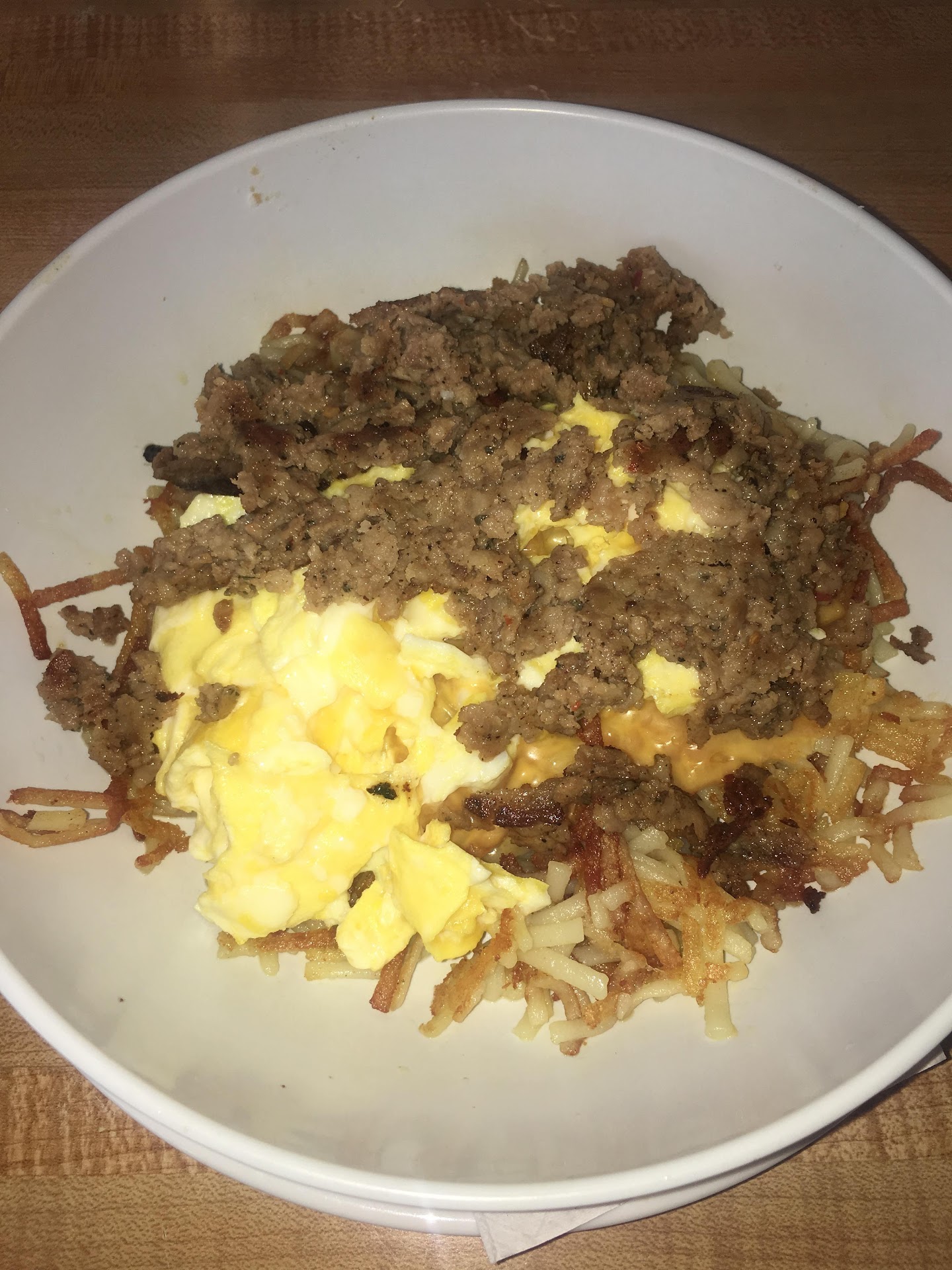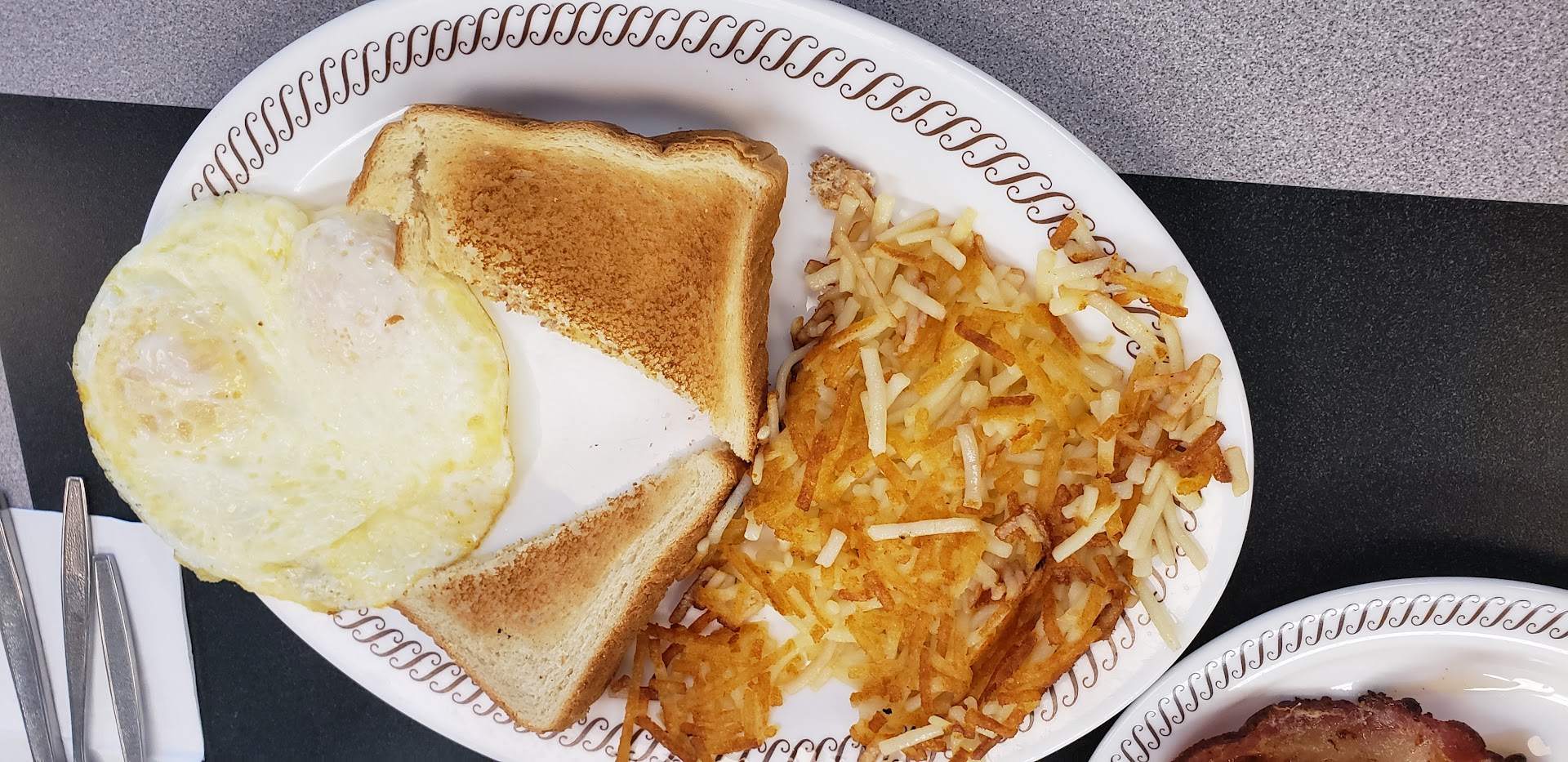 Read moreOk. This was my first and last experience at a Waffle House. My friend and I walked in to have breakfast after a long night and sat down at the counter. We sat there for a few minutes before being greeted by at least 3 waitresses promising someone will be right with us. And finally after being there for about 5 more minutes, Miss Rhonda strolled our way. First of all, let me just say that this lady, from her grey teeth to her greasy pony tail, seriously need either a hit of whatever she had been smoking, or was just coming down from an all-night crack bender. She was, needless to say, tore up. From her slurring words to her inability to maintain a steady gaze with anyone, to her constant blaring unintelligible orders at the cooks, Miss Rhonda will forever be remembered as the worst waitress that ever lived. After nearly being knocked from my bar stool by one of the other waitresses trying to wipe the counter down with a questionable-looking dish rag, Miss Rhonda finally took our drink order. It took only a minute for her to sit them down on the counter. I don't usually drink from straws, so when I started to put my cup of tea to my lips she said, "I wouldn't do that if I were you." "What?" I asked her. "Oh...nothing", as she trailed off shuffling away from us. I was pretty sure she was telling me not to drink from my cup because it was dirty. I hesitantly took a sip as Miss Rhonda trudged back towards us. She grunted at us to give her our order, which we did...with some difficulty. I think she has a hard time reading when she is lit. Finally, after forgetting to tell the cooks we ordered, Miss Rhonda yelled at them to rush it. It had been at least 10 minutes since we gave it to her. I could say a lot more about Miss Rhonda, but I will conclude by saying that we gave her a 3 dollar tip. We would have given her 5, but I'm pretty sure she would have just used that to get another fix. One last thing I will say is that we really don't know how this "restaurant" received a 96.5 inspection rating. They would have really needed to clean that place up to earn that. Turn your life around, Miss Rhonda. We...