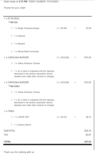 Read moreI just placed an order totaling almost $40, and I’m really disappointed with the experience. The fact that my burger bun was upside down both buns, no less is ridiculous and shouldn’t happen. How do you miss that? I ordered the Carolina Burger, and it tasted overwhelmingly like mustard with no chili at all. It looked as if half a bottle of mustard had been poured onto it.