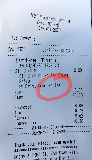 Read moreThis review is solely based on the service I received and not about the food, because I did not receive any. I visited this location last night, 8/5 around 9:30 pm. They closed at 10:00 pm, so in my mind I had plenty of time to get food. When I pulled up in the drive thru to place my order, before I could say anything I hear, "Sorry we are not taking anymore orders." So, I say, "Oh, I thought you closed at 10:00?" and the reply I received was, "Yes, but we don't have anymore food." Huh???? I was confused because how do you run out of food and not have anything to offer customers! Or was it because it was close to closing and the staff you not want any new orders? There was no apology given and my customer service experience at this location was very lacking. I live in Cary so Zaxby's is the closest to me, but I am not sure if I will patronize this establishment again. I understand that things happen and there could have actually been a good reason why this happened. However, the lack of explanation and the tone of the person I interacted with made a huge impact on my...