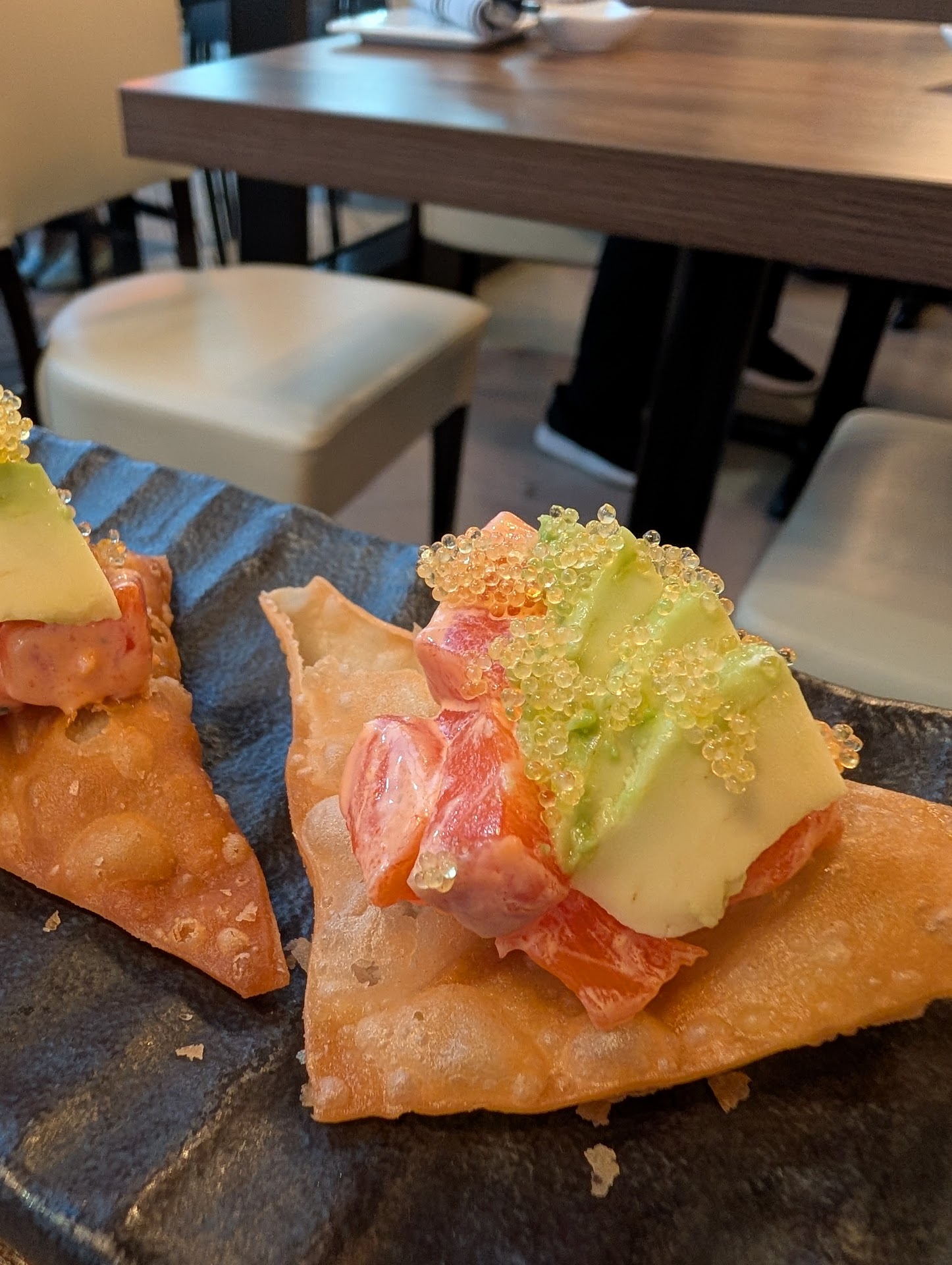 The big miss for us was the food. I left extremely disappointed and we spent a considerable amount on dinner. We ordered 3 small plates to begin, and started with the Salmon Poke Crunch. The wonton chips had a nice crunch but that's about the only good thing I had to say about this dish. Fish was low quality and the flavor profile was missing something - it was very one-note. Secondly we had the spring rolls. They were fried in oil too hot - it browned the outside way too quickly, leaving the inner wrapping raw. All night the veggies were prepped far too small, and that caused issues here because they mixed with the starch from the raw wrapper and turned gelatinous. Lastly we tried the Thai lettuce wraps. This dish came with sweet & sour sauce for some inexplicable reason but the chicken mixture was so saucy that nothing more was needed. Since it was served on the lettuce itself, there was no dignified way to eat this. The lettuce was soggy after 2 minutes, and I was covered in sauce and sticky from trying to eat. Because the plates they give you are entirely flat with no ridges or slopes, the sauce ran off onto the table. I said to my wife "well... I hope the sushi is good!" At this point, both of our cocktails were done and no one offered a second or asked anything about my empty glass. It just sat on the table the rest of the night.