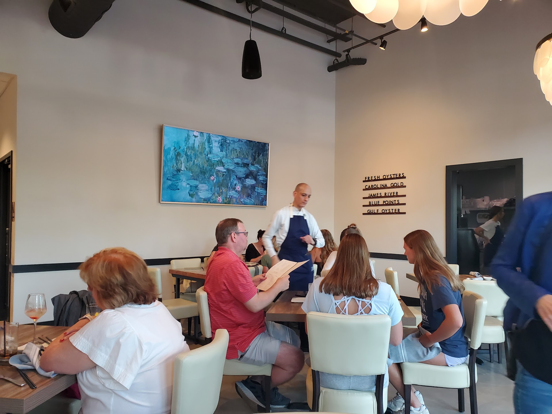 Service - No major complaints. Friendly, attentive, knowledgeable. The tables are so close together where we were (2-top by the bar) that when a server at the table next to us had to clean up a broken glass, his rear end was in my face. Not his fault, because the tables were just that crammed in. Hosts and everyone we interacted with were really lovely.