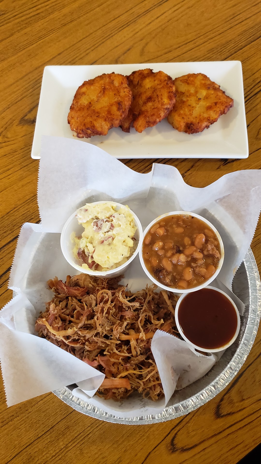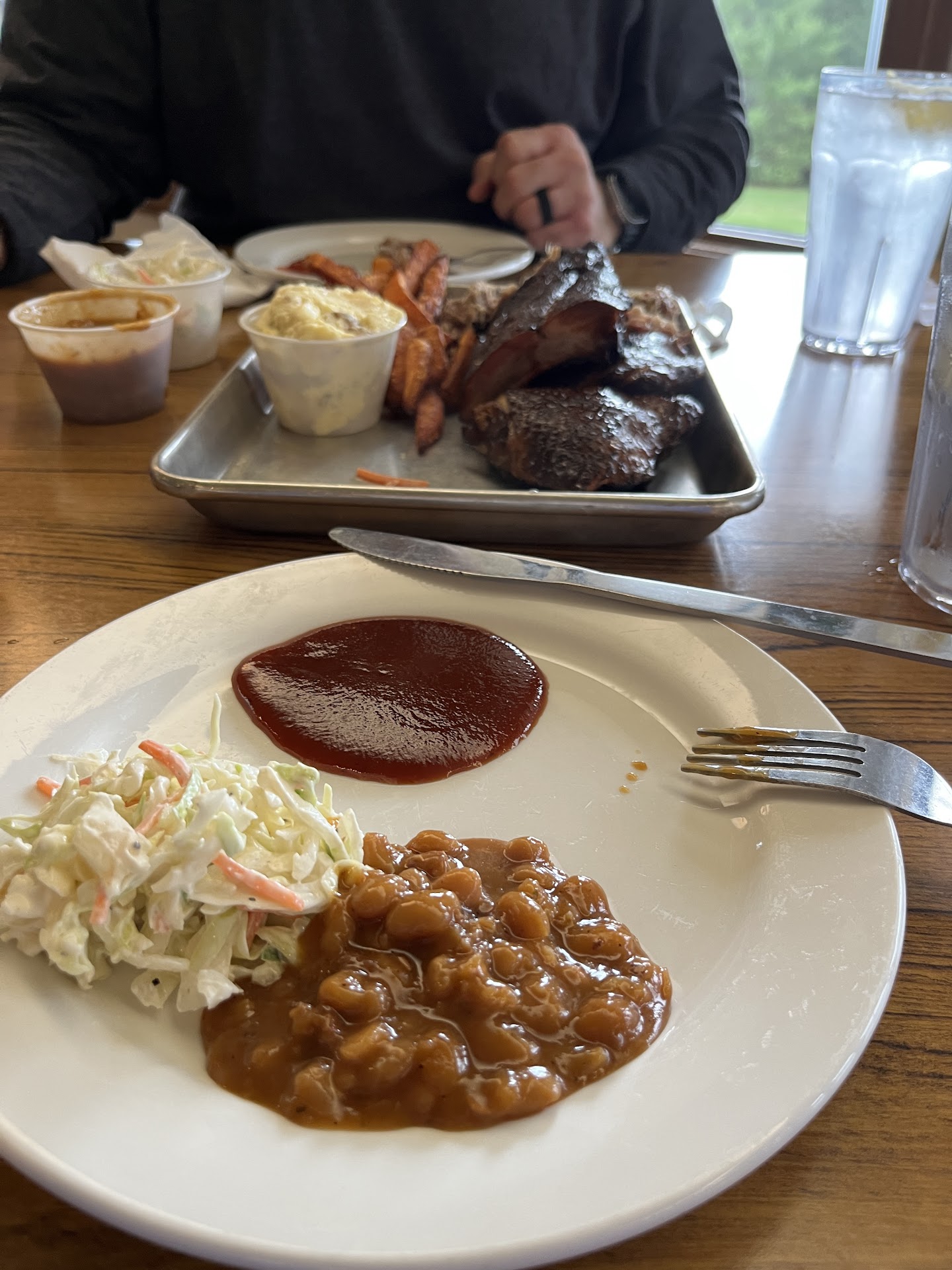 Read moreWondered in on a rainy St Patâs day and was warmly greeted by the hostess. We were seated by the window overlooking a beautiful expanse of rolling green grass and beautiful trees. Our server, Heather, greeted us and quickly brought us our requested drinks. We asked for suggestions on what food was most ordered and she suggested the BBQ sampler plate (chicken thighs, ribs, pulled pork) all smoked in house. Four sides accompanied the meats and we could change them if we didnât want the beans, cole slaw, potato salad, and sweet potato fries. We kept the sides as offered. Our food arrived after about 15 minutes- and from the first bite to the last, you could tell they cared about what they served. The pulled pork contained no fat- or at least none that I saw- and was so flavorful! The BBQ smoked chicken thighs were moist and smoky and without a doubt the best smoked thighs I have ever eaten. I am not a huge fan of ribs, but tried them and they were meaty and well seasoned. All of the sides were better than good! Our server kept our waters full and checked in on us frequently. When we were checking out- a trio of ladies got up and did an a cappella tension of an old church hymn for their friends birthday, they were awesome- everyone stopped and listened. Very, very enjoyable dining experience- we will...