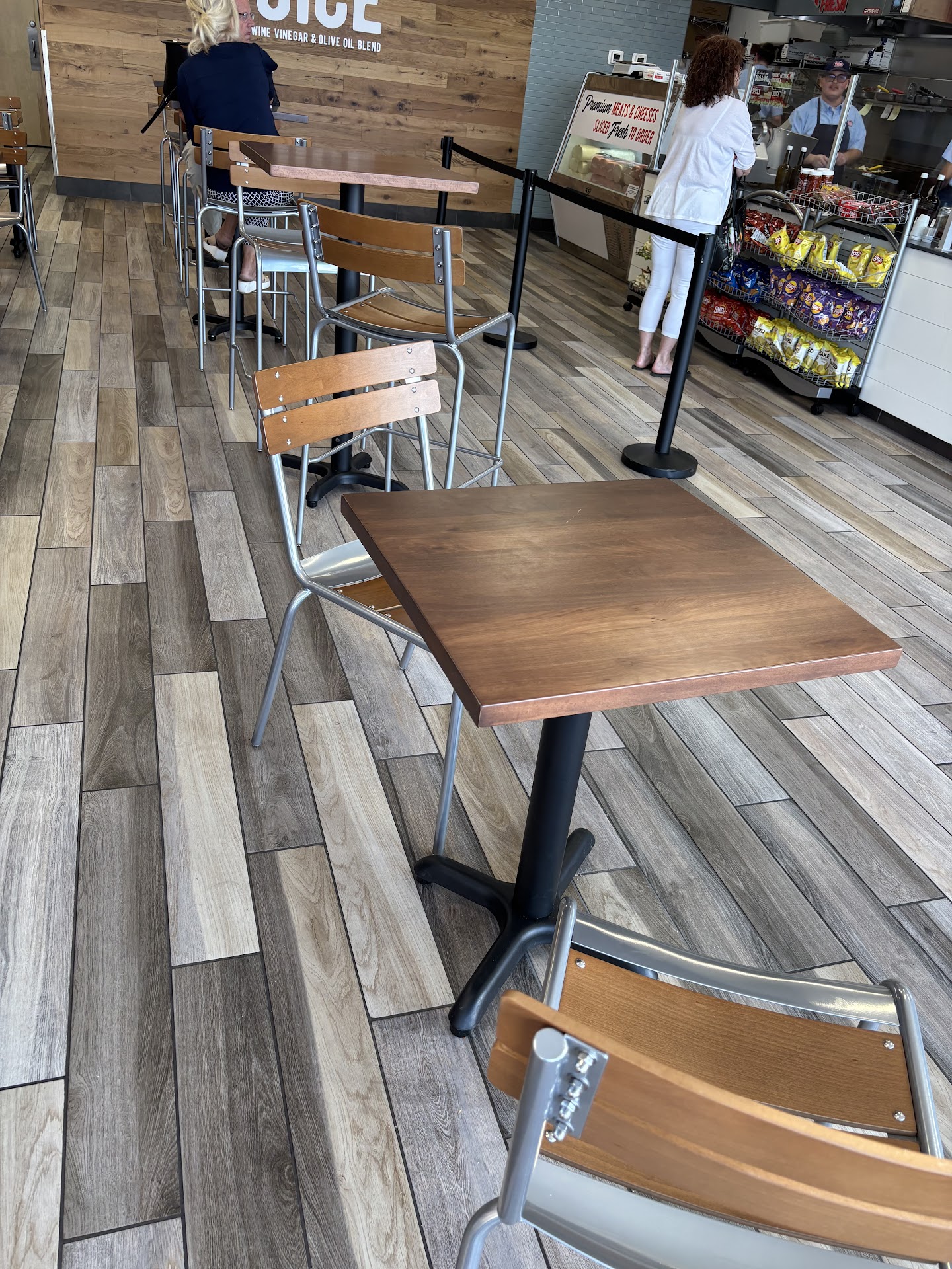 Go to Eegees instead We walked in and saw that all of the tables were dirty The trash was overflowing.So we got our order to go. We got two regular sandwiches and the kids meal. We did not receive a bag. Staff was not particularly rude, but Definitely not friendly And welcoming. And instead of ordering at the register, you go to the other side of the counter where your order gets written down on a paper that you bring to the register Definitely not efficient. Then your sandwich is made and they ask you what you want on it so you have to order for a second time. Food is extremely overpriced It’s like an expensive Jimmy John’s except they slice the meat in front of you The meat and cheese Slices are exceptionally thin Couldn’t even taste the cheese. Bottom of the breads were covered in cornmeal super Disgusting. So much oil and vinegar made the sandwich is really soggy and the top bread and bottom bread are not connected, So it’s just a mess .Lettuce was Extremely thinly shredded As well as the onions Couldn’t even tell they were there. It tasted likeIt was just a soggy bread with cornmeal and lettuce. Super disappointed in the whole Jersey Mike’s experience we Will not...