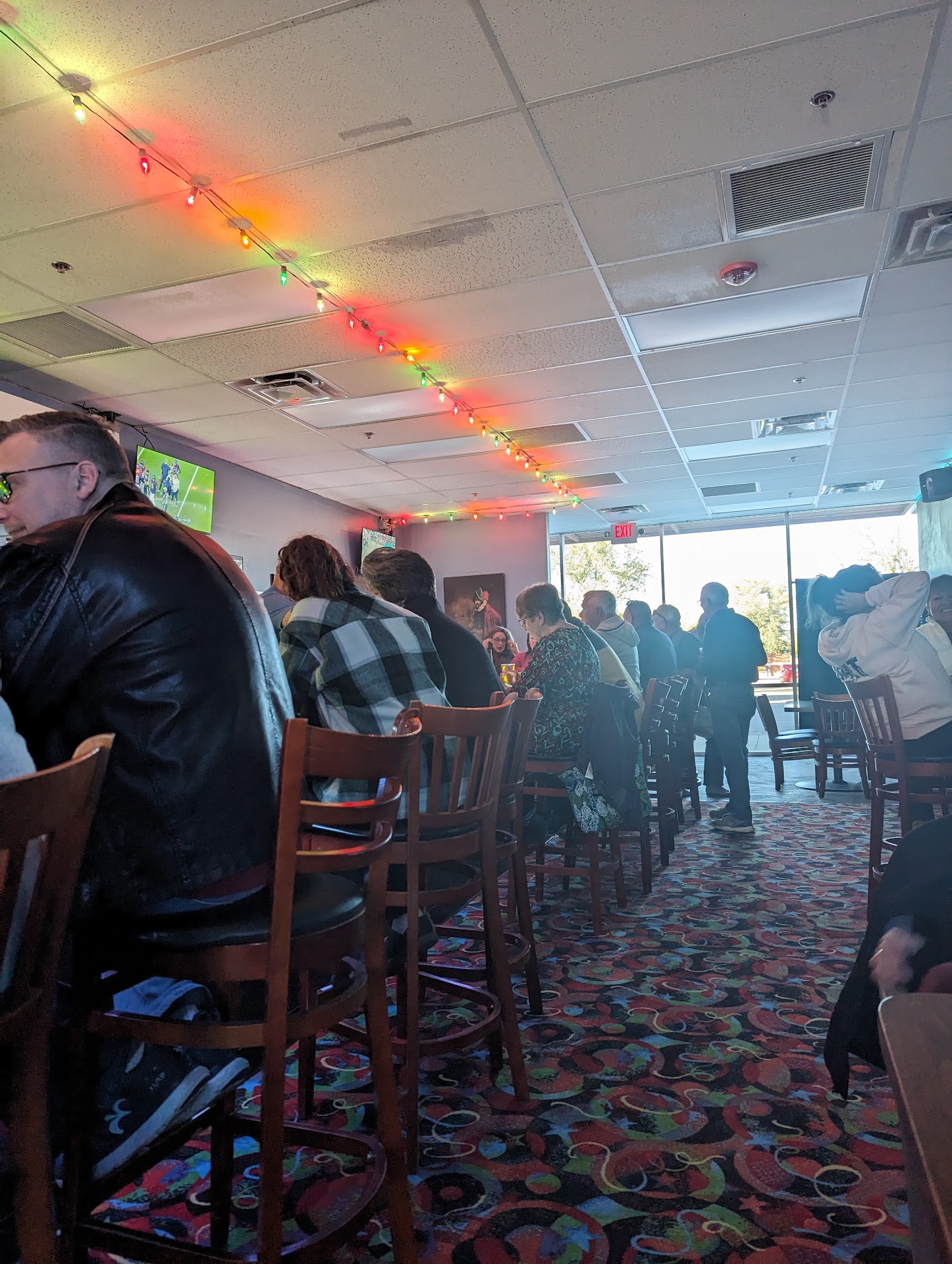I have no rating for food as they don't serve any. They do allow you to bring in your own though. I gave service a 3 because the day bartender was horrible. She never came to take my order although twice she said she would be right there. She made my drink incorrectly twice! In her defense, I was told she was new. She was flailing and should not have been left alone if she was not ready to handle the bar yet. We were there for shift change and the night bartender definitely made up for it! Chelsea was attentive, friendly and an all around great bartender. It seemed like everyone loved her! Atmosphere also got 3 stars because the bar is tiny and cramped feeling but the customers were fun...
