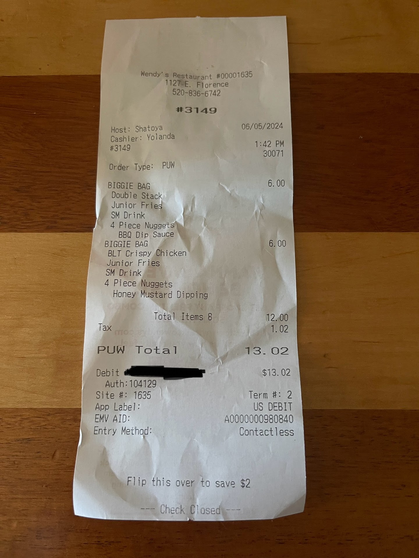 Read moreI'm 67 years old and couldn't remember the last time I tried a Wendy's burger, so the wife and I decided to stop by. We decided to sit in the dining room.