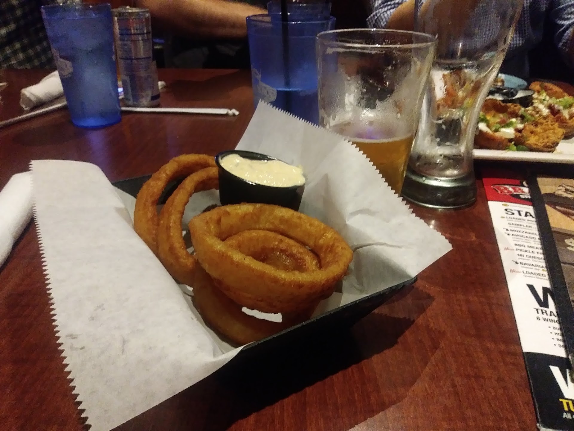 The is roughly standard for bar fare. Plain white wax paper lines a reasonably good facade of a basket (made of plastic, but designed to vaguely resemble wicker). The onion rings don't quite fill the container, making the portion size seem more scanty than it otherwise would. The haphazard toss of a plastic container of the purported "Bistro Sauce," which, to the best of my limited knowledge, doesn't resemble in any way, shape, or form what one would get in a bistro, speaks to an apathetic lack of care in the plating.