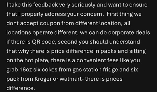 Update(9/21) So I wrote that review a month ago and as you can tell by their response, theyâre not taking the situation seriously at all, whatsoever. I am not a person to tarnish a âsmall businessâ. if you can tell based upon my profile on Google, I actually review things respectfully and give them reason as to why I didnât like their product. Thats what a review is for?? Itâs crazy to me that youâre trying to make it seem like Iâm just causing issues when it was you that made it seem like I was just using a random coupon to get something free. I screenshot your response just in case you deleted it so everyone can see that youâre not a professional General manager and you dont care about customers opinions, you just think people are trying to rip you off. If a consumer is not getting their goods and services or treated with respect when they have done nothing wrong then of course theyâre going to complain. Also, I never said that I can complained constantly, I said I complain at a different location in an entirely different state which is why i had to coupon on my account jn the first place. Also, i told the company to delete my account because i didnt want their business if someone like you works for them. I also have proof of that email too, so how in the world would i receive another free item??? So get your facts straight before you sit here and attack me on Google reviews đ