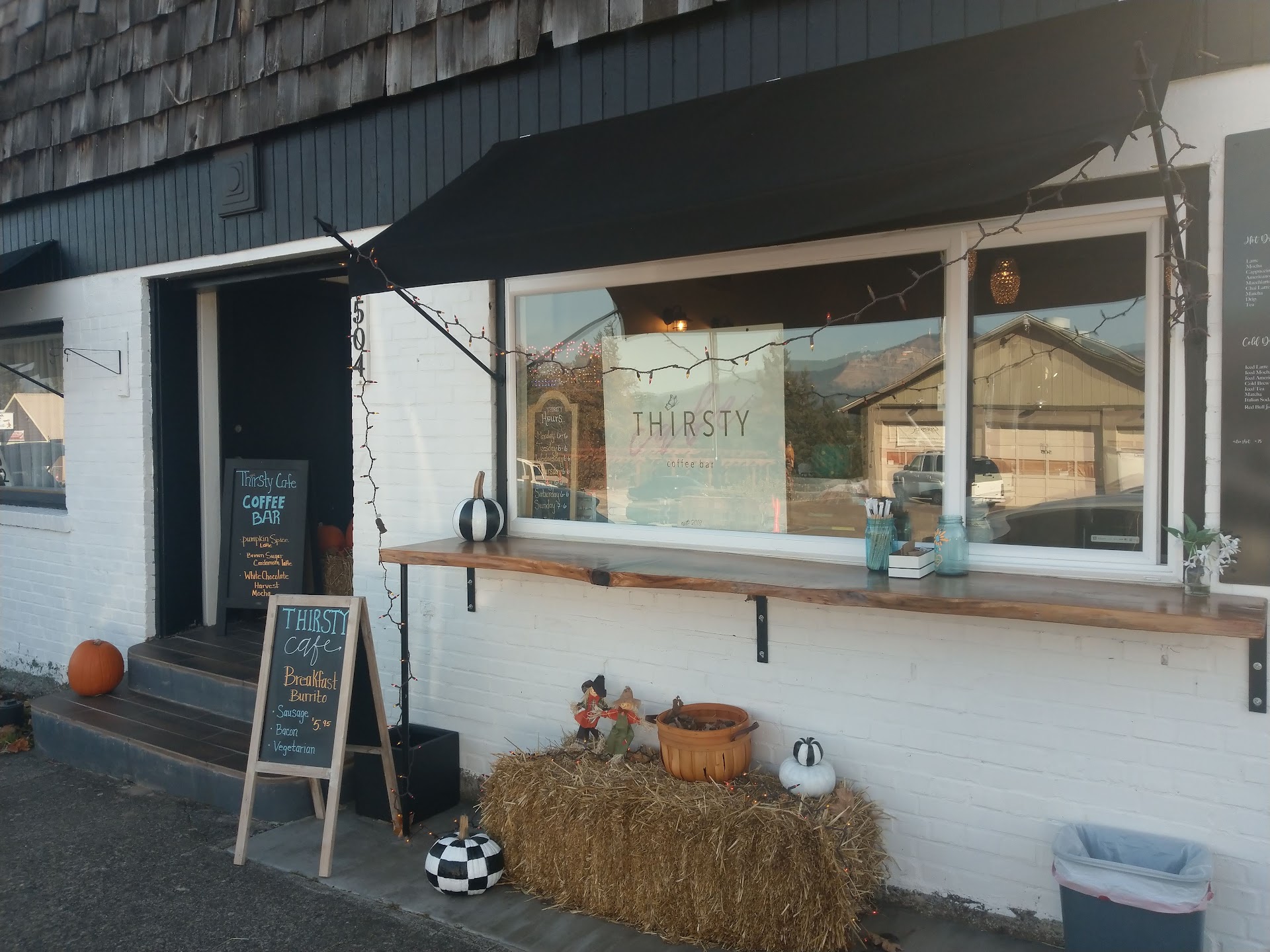 ย ย ย Read moreI live in Stevenson, and decided to snail my way over the beautiful Bridge of the Gods to "hike" on the easy-to-walk paved trails of the Historic Columbia River Highway State Trail. I thought a nice hot latte would be just the thing to keep me company, but I hadn't noticed anyplace in town to go for a latte, until now that is. This low-key on the outside, ...modern and fresh on the inside, small-town, coffee shop...other-wise known as, The Thirsty Coffee Bar, was easy to find and did not disappoint!!! The coffee was really fantastic, and perhaps just as importantly, came as ordered...16 oz. Skinny hazelnut...extra hot...no foam...dee-LI-CI-ous!!! There were many delectable temptations to eat that I saw, but I was out to walk to BURN calories...i didn't want to put more on before I had even begun. But I'm not gonna lie...as i sit here writing this...I have the worst craving for the huge piece of pumpkin cake with a quarter inch white frosting that i saw while I was there....UGH! Well maybe...
