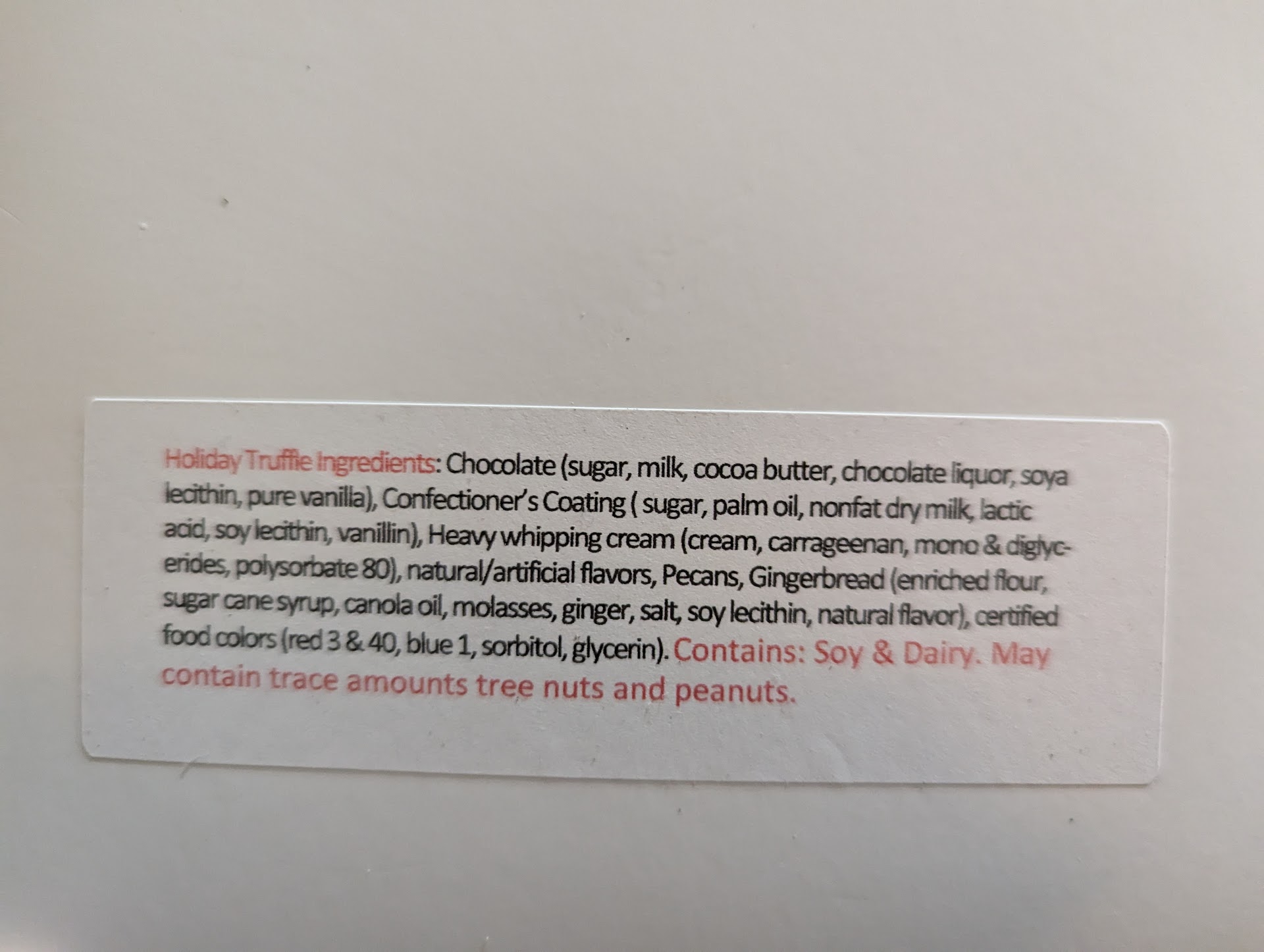 Tree nut allergies are not like a dairy or gluten intolerance, they can actually kill you. Your chocolates are not a may contain when they do in fact CONTAIN tree nuts. Pecans are tree nuts, if you aren't sure, a simple Google search would tell you they are. The list of chocolates in the box aren't available to see until the box was opened. The FDA requires you to to list the pecan as a tree nut in the ingredients list, or to put it in the contains section (not may contain). Please see the screenshots of the FDA website I added. Additionally, it doesn't take much to simply say, " Thank you for the heads up, I hope we didn't cause any harm, or a trip to the ER." and I would have gladly taken...
